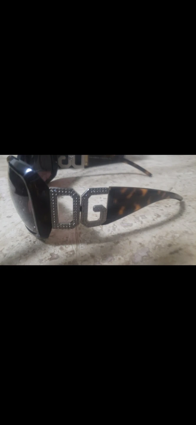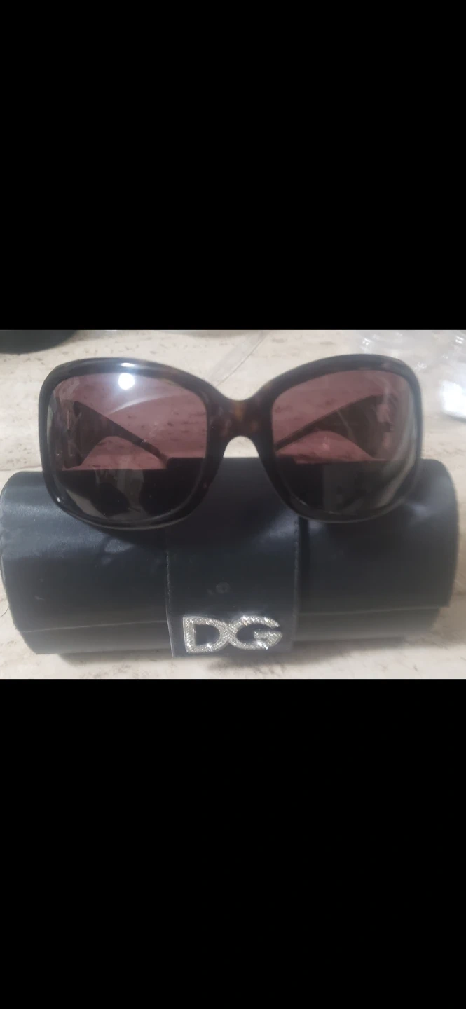 These are Dolce & Gabbana sunglasses. They have a tortoise shell pattern on the arms and a distinctive DG logo detail on the frame. Includes a black satin case with DG emblem.