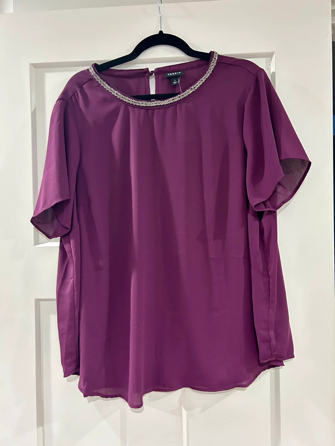 Brand new Torrid georgette blouse in a rich Winter Bloom (deep purple) shade. Lightweight, flowy, and slightly sheer with a beautiful embellished neckline. Easy to dress up for work or wear out.