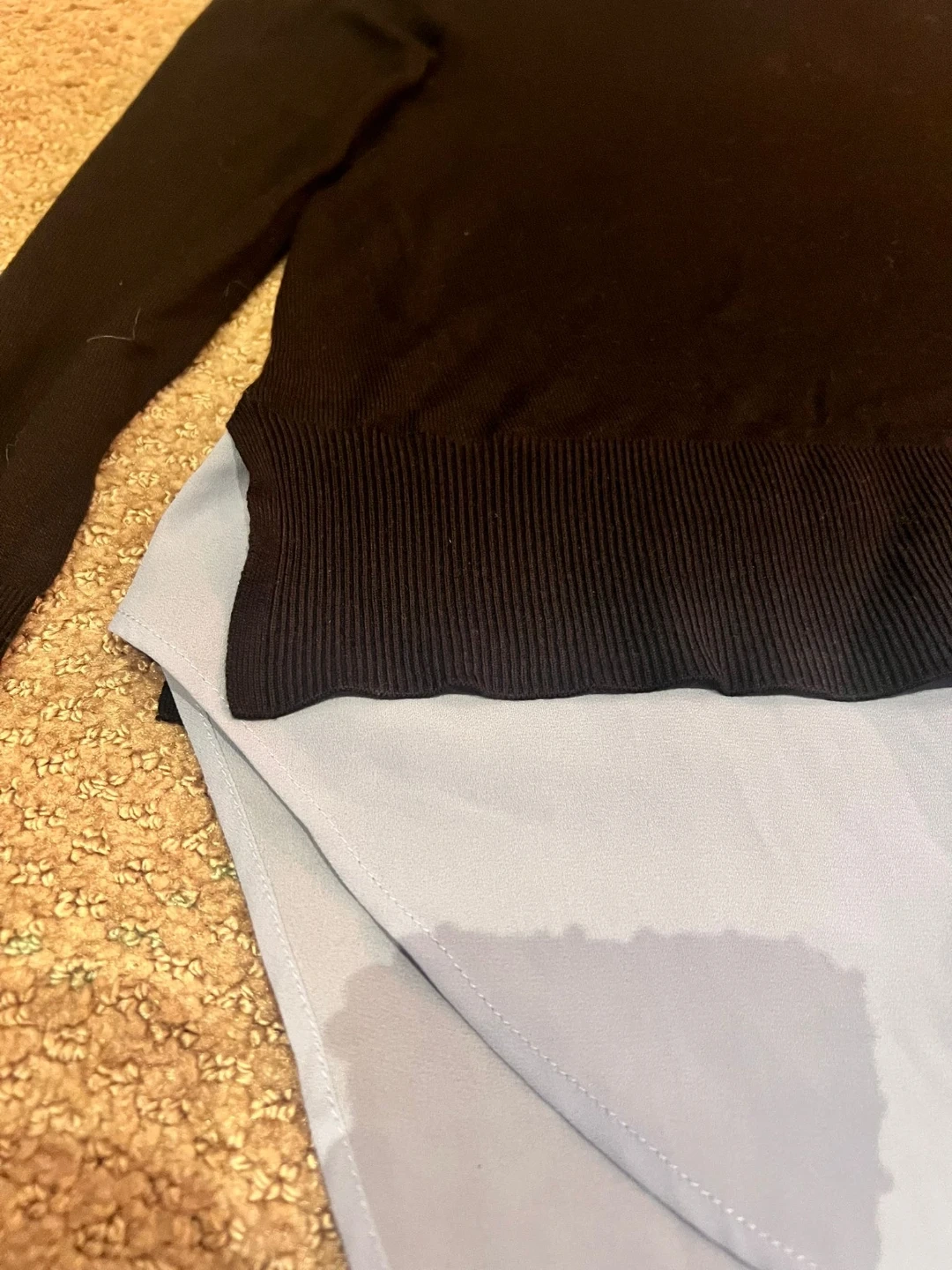 This black long-sleeved sweater has a light blue lower layer. It's a stylish piece for any wardrobe. Offers a comfortable, layered look.