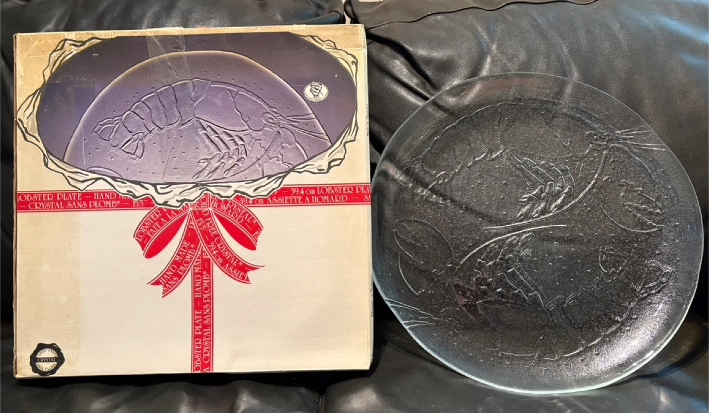 Selling a beautiful crystal lobster plate! It's hand made and measures 15.5 inches (39.4 cm). The plate features a lovely lobster design. Comes with the original box. Pick up only south side, message me for more info.