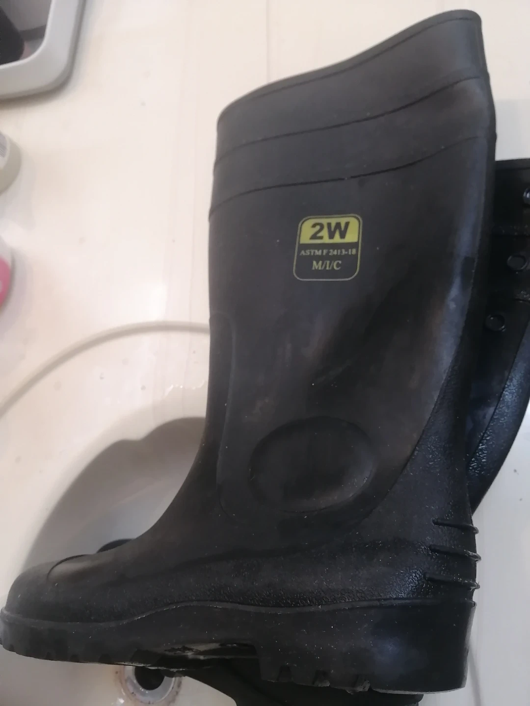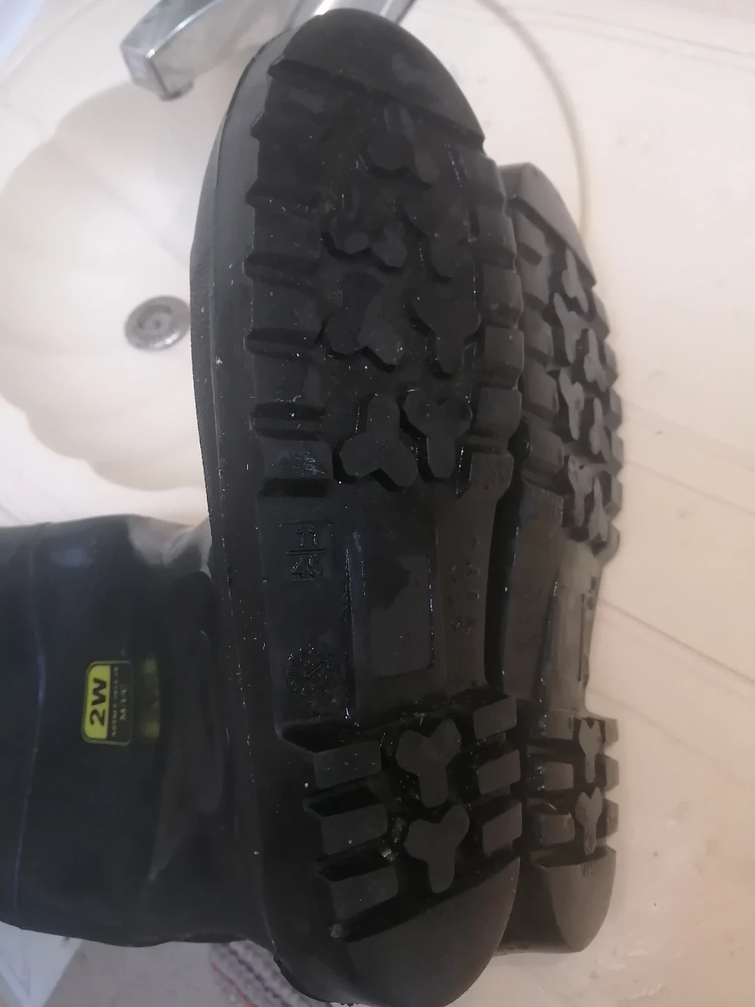These are black steel toe rubber work boots from 2W. They feature a durable construction suitable for various work environments. The size is marked as M/C, and there are also markings for 38/45 on the sole.