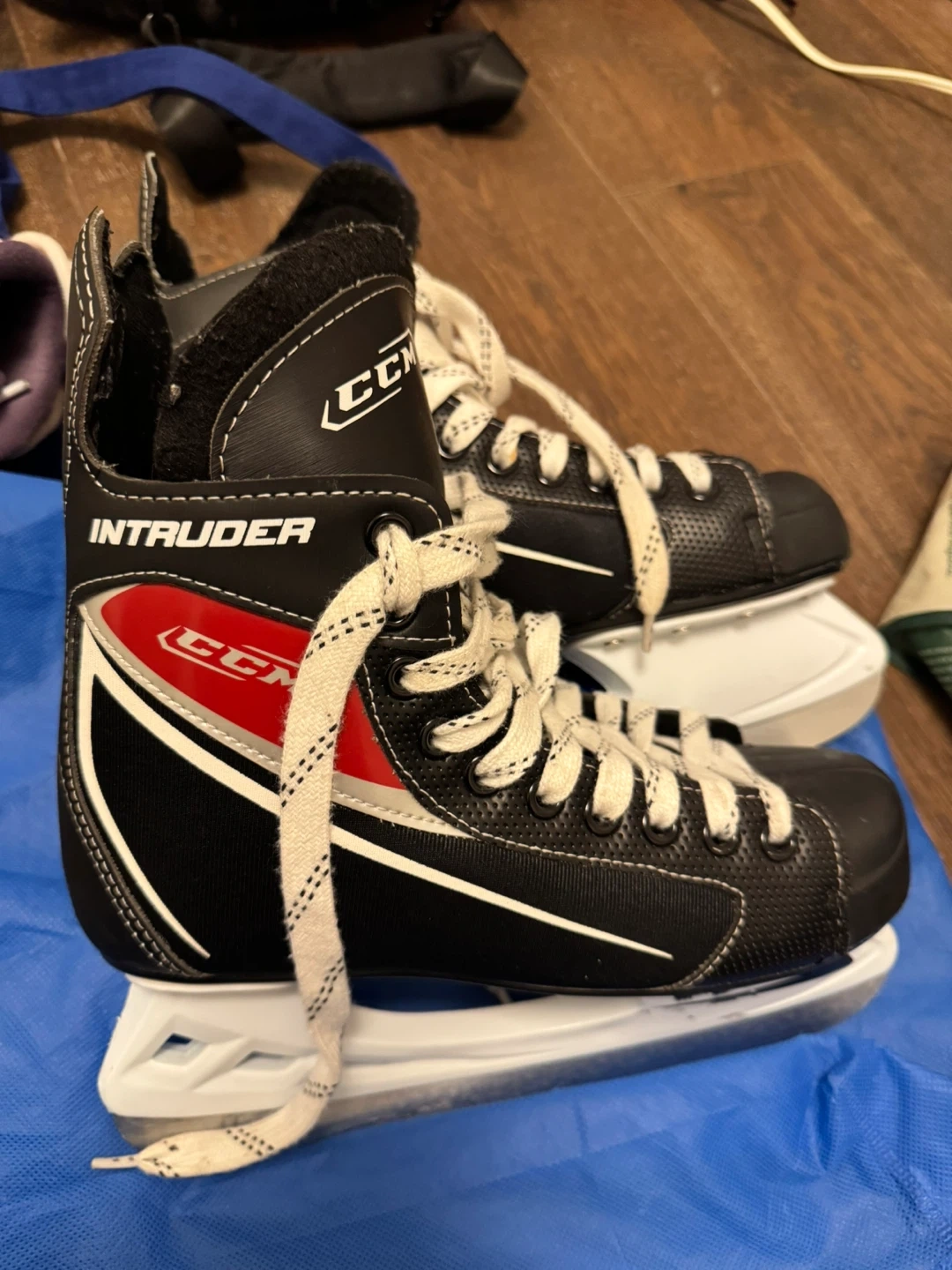These CCM Intruder hockey skates are black with red accents. They feature classic white laces and a durable build. They're designed for performance on the ice.