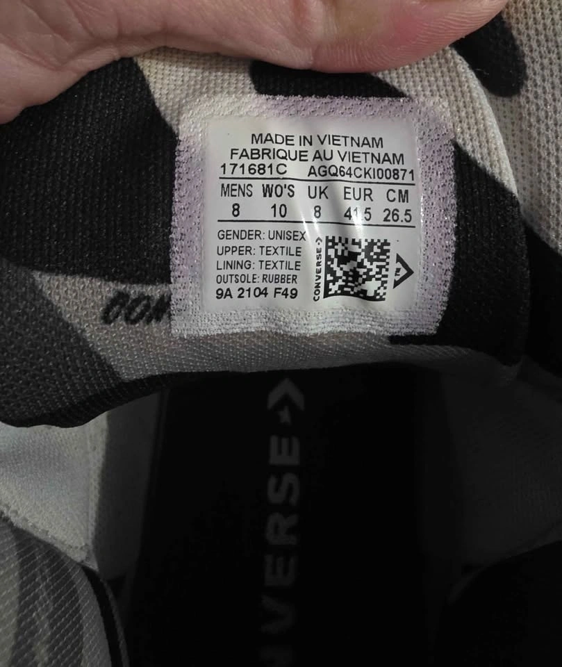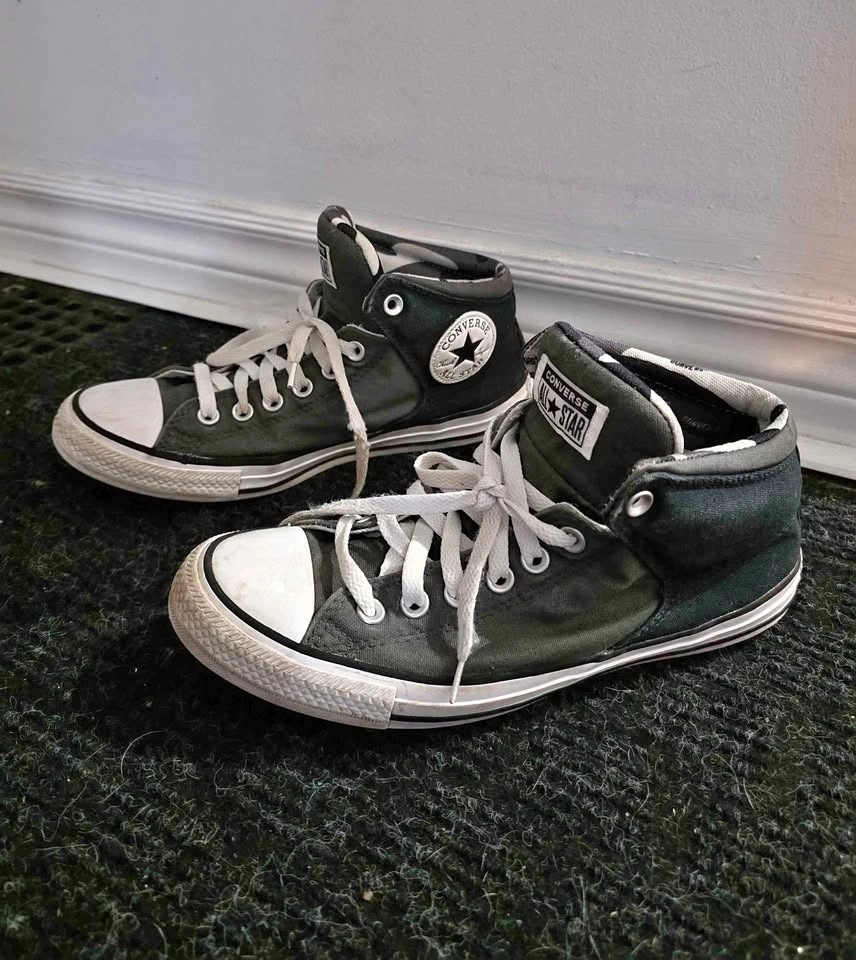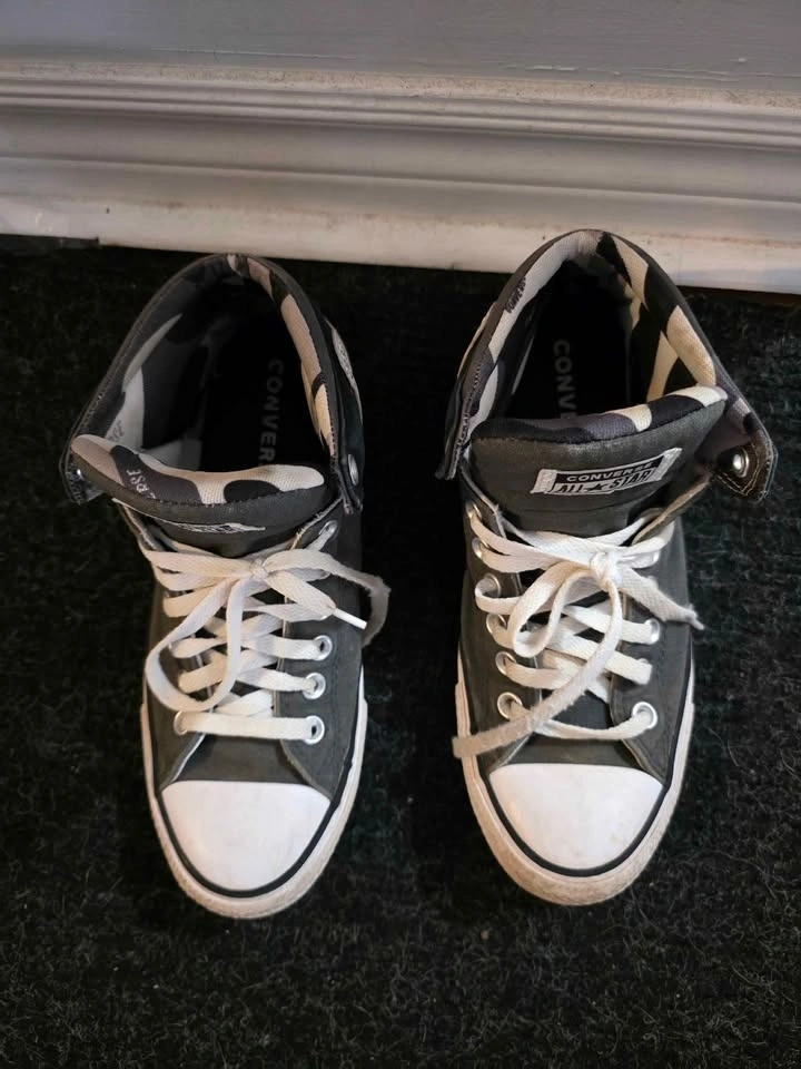 Men's size 8 Converse Chuck Taylor shoes. Colors are grey with an army print design on the inside. These sneakers feature the iconic Converse logo on the tongue and comfortable ankle padding.
