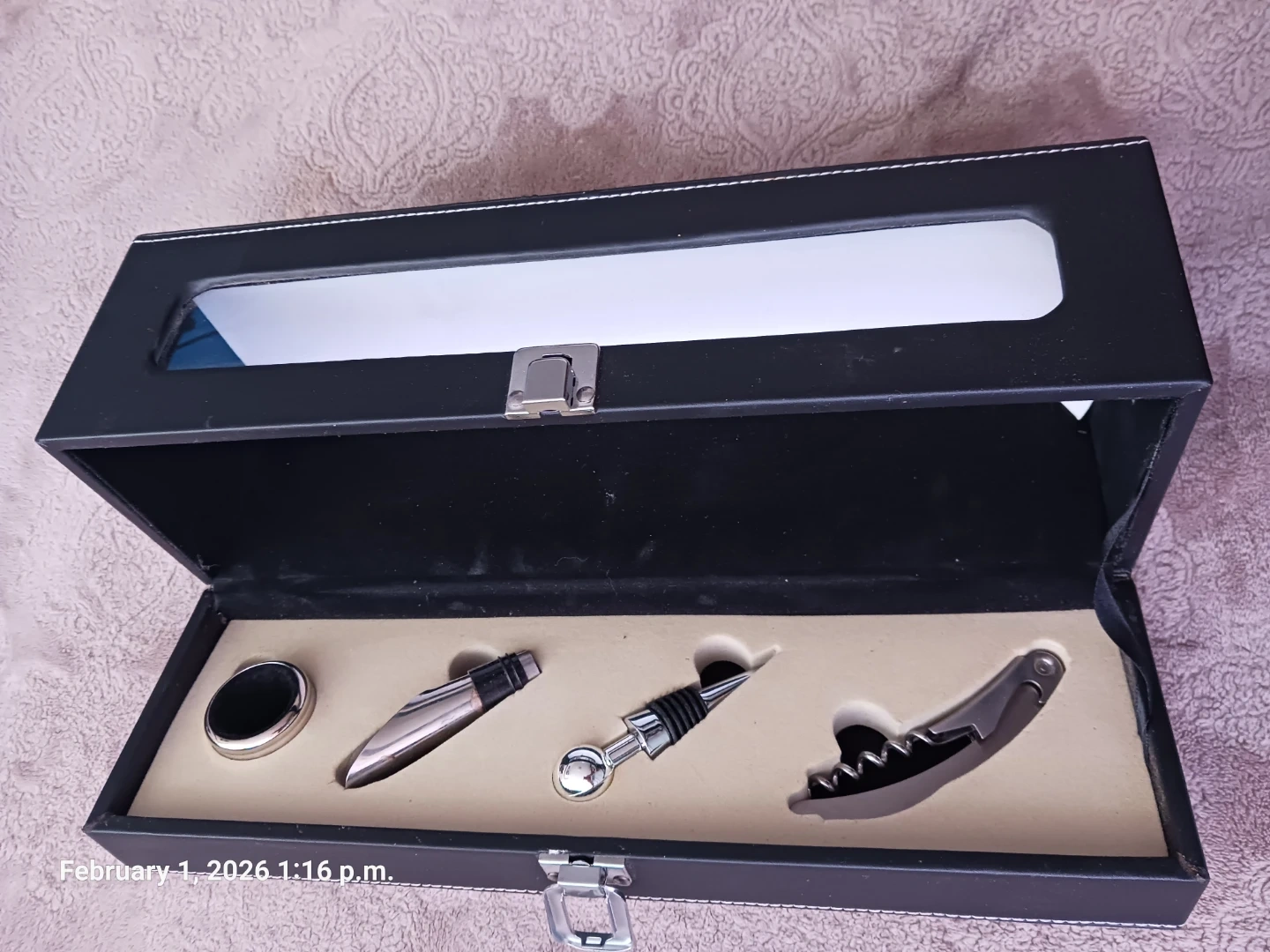 This wine accessory set comes with a stopper, aerator, and corkscrew. It's all housed in a black faux leather case with a clear window and secure latch. Great for entertaining or as a gift!