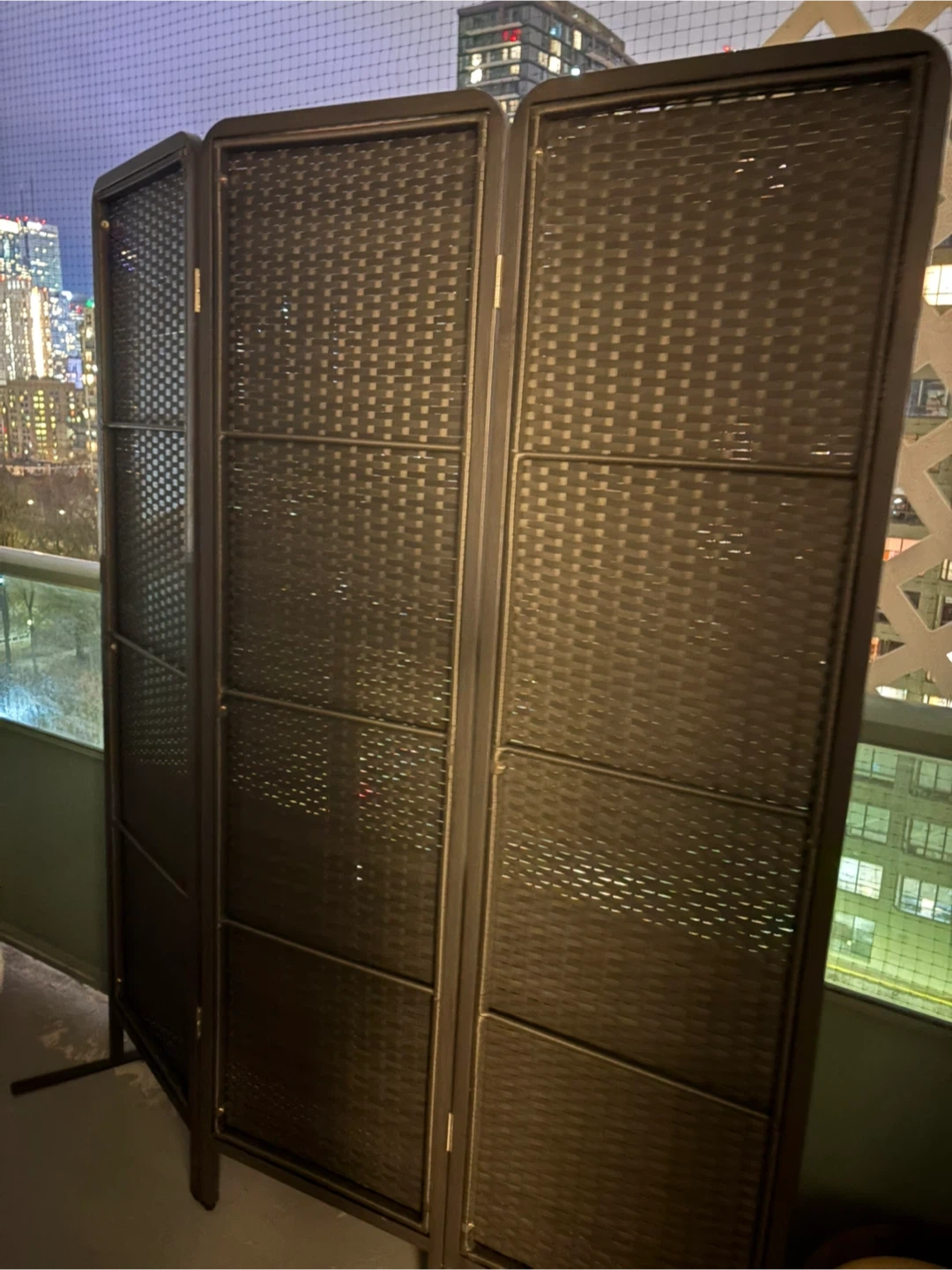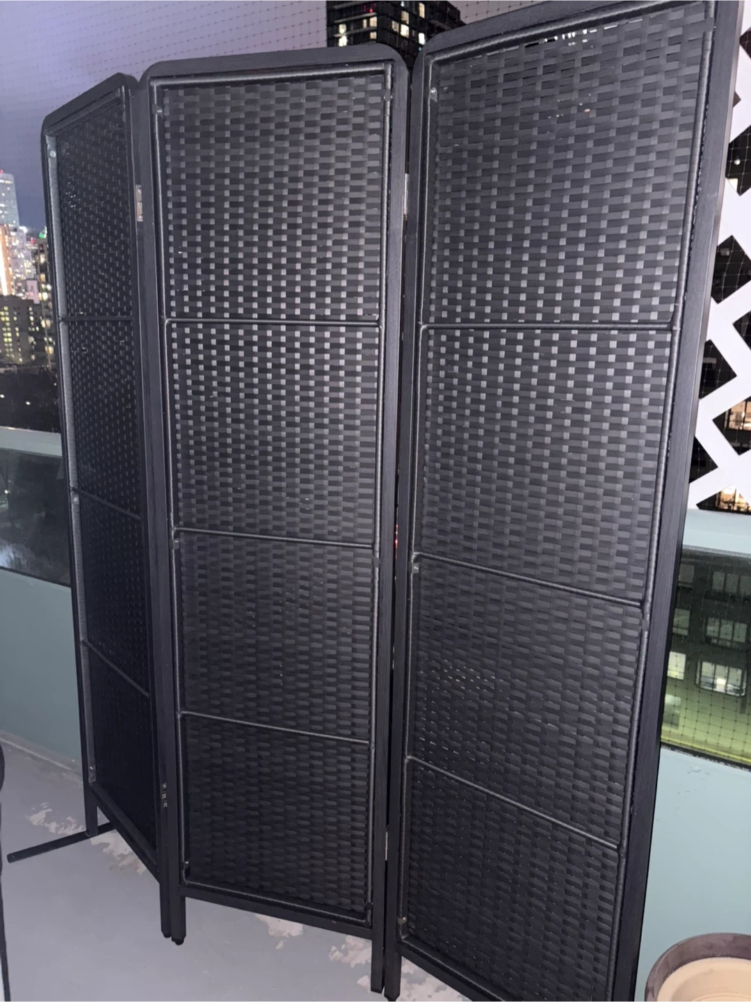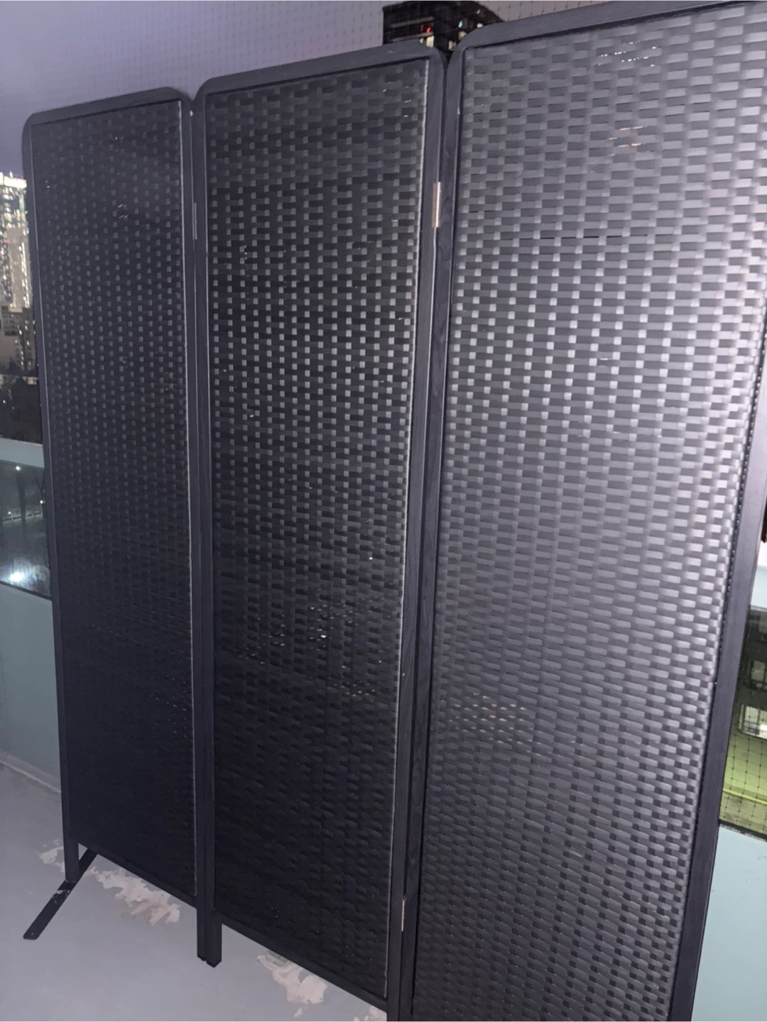 This is a black woven room divider that's perfect for adding some privacy to your space or creating a cozy nook! It's in great shape and ready to use in your home, foldable in three sections