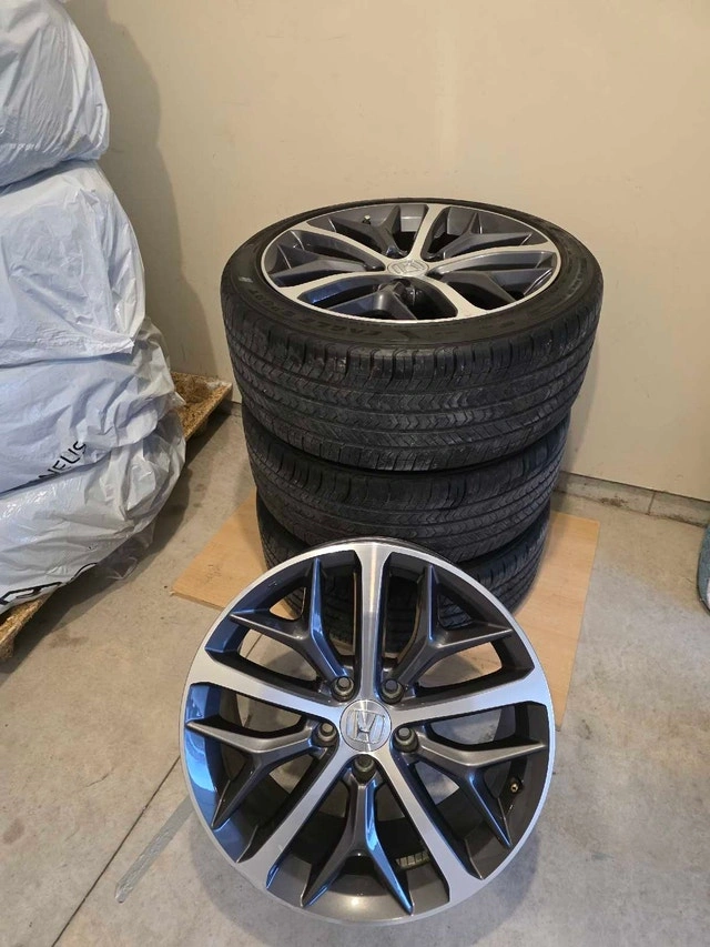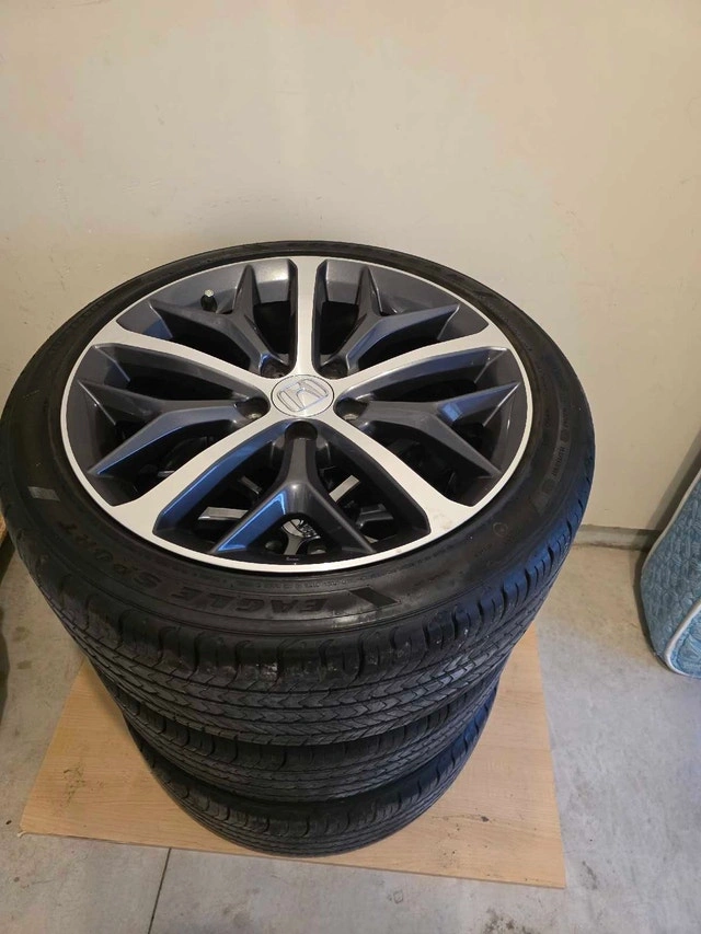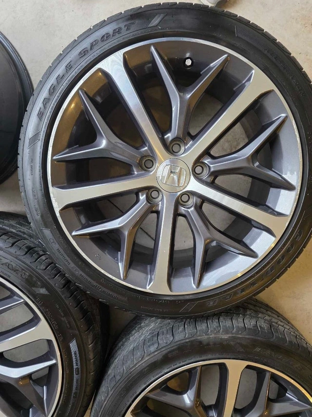 Selling a set of four (4) original 18-inch alloy wheels from a newer Honda Civic Touring. These are the premium machined-face wheels with charcoal accents. Three (3) wheels include Goodyear Eagle Sport all-season tires with low mileage and excellent tread. One (1) wheel is a bare rim. Overall great shape; one rim has minor curb rash as shown in the photos, but it does not affect performance. Specifications: Size: 18×8 inch, Bolt Pattern: 5x114.3, Offset: +50 mm, Center Bore: 64.1mm. OEM Part #: 42700-TGG-A82 (fits 2020-2024 Civic, Accord, HR-V, and CR-V). Price: $1200 OBO. Brand new cost around $717 for one at the Honda dealership.