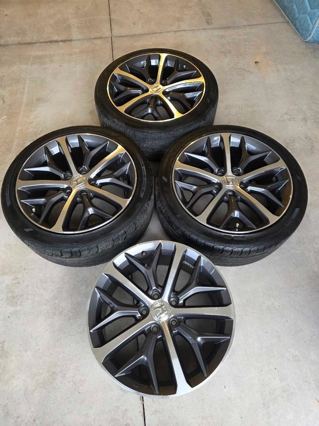 Selling a set of four (4) original 18-inch alloy wheels from a newer Honda Civic Touring. These are the premium machined-face wheels with charcoal accents. Three (3) wheels include Goodyear Eagle Sport all-season tires with low mileage and excellent tread. One (1) wheel is a bare rim. Overall great shape; one rim has minor curb rash as shown in the photos, but it does not affect performance. Specifications: Size: 18×8 inch, Bolt Pattern: 5x114.3, Offset: +50 mm, Center Bore: 64.1mm. OEM Part #: 42700-TGG-A82 (fits 2020-2024 Civic, Accord, HR-V, and CR-V). Price: $1200 OBO. Brand new cost around $717 for one at the Honda dealership.