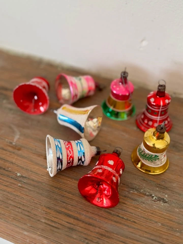 Original Glass Clappers: These ornaments feature the rare "teardrop" glass bead clappers inside, a detail often missing from vintage bells.