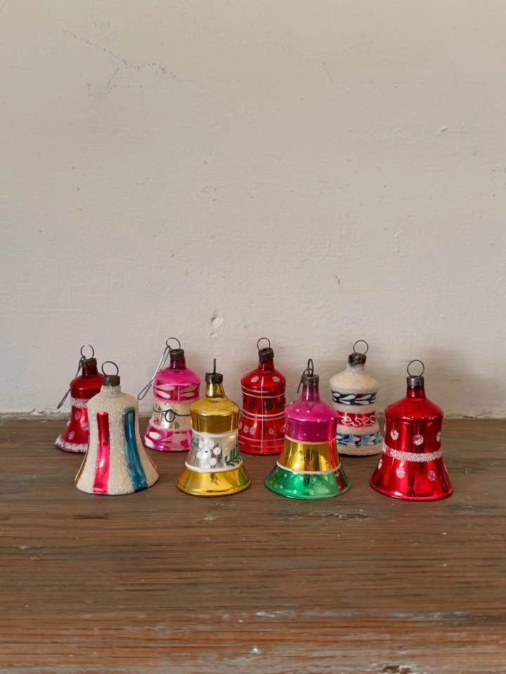 Stunning collection of 8 Mid-Century mercury glass bell ornaments. These are premium European pieces with metal caps stamped Czechoslovakia.