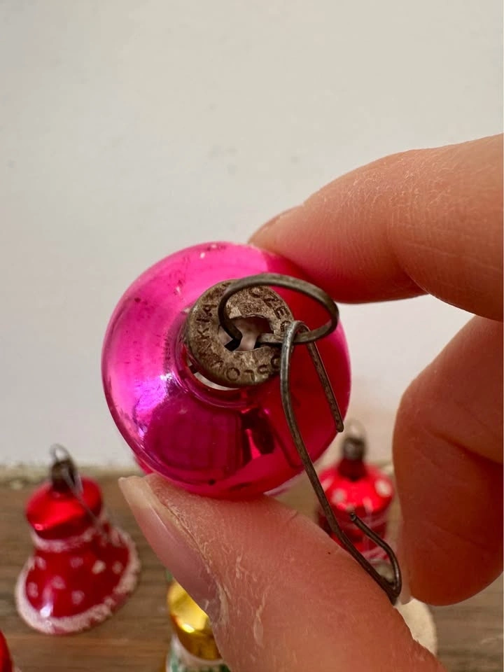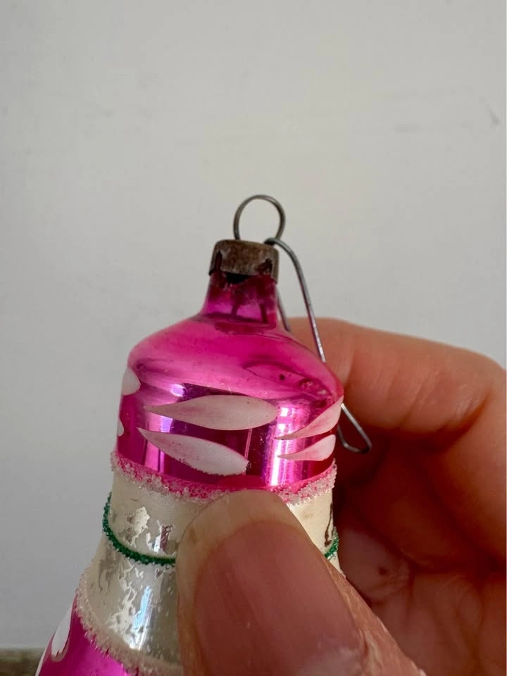 Condition: Excellent vintage condition with a beautiful aged patina. All ornaments have their original caps and hangers. One ornament has a crack at the very top of the neck; however, the cap fits, it hangs perfectly (see last photo)