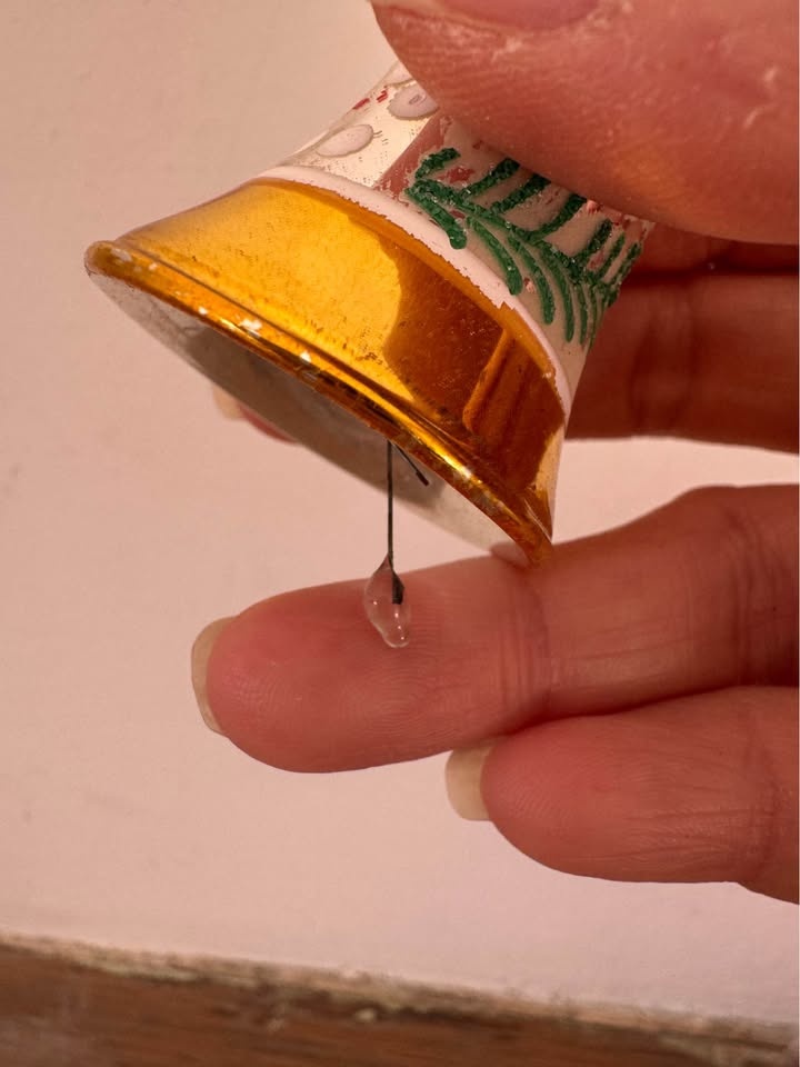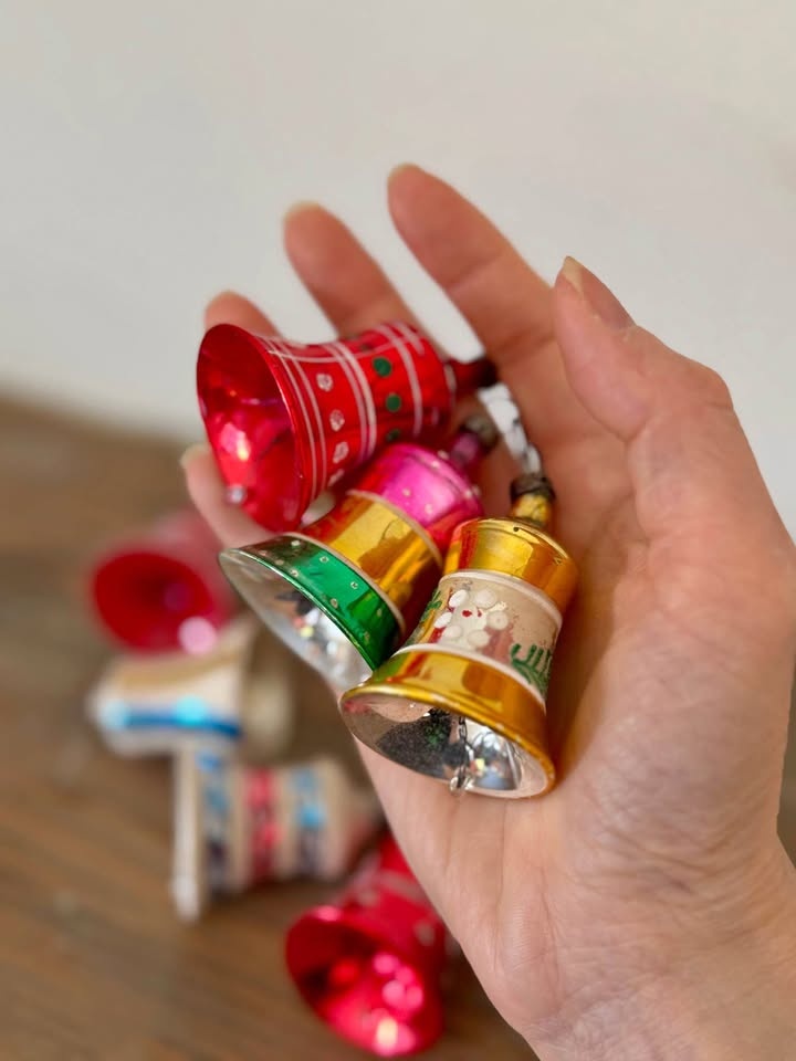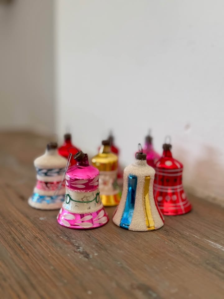 Original Glass Clappers: These ornaments feature the rare "teardrop" glass bead clappers inside, a detail often missing from vintage bells.