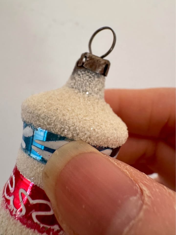 Condition: Excellent vintage condition with a beautiful aged patina. All ornaments have their original caps and hangers. One ornament has a crack at the very top of the neck; however, the cap fits, it hangs perfectly (see last photo)