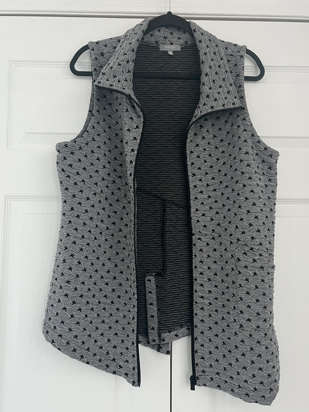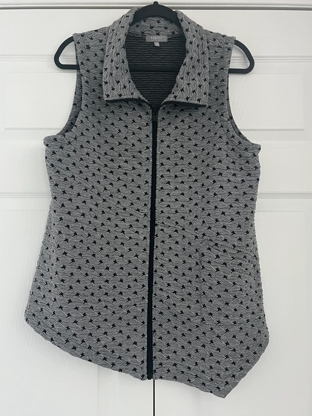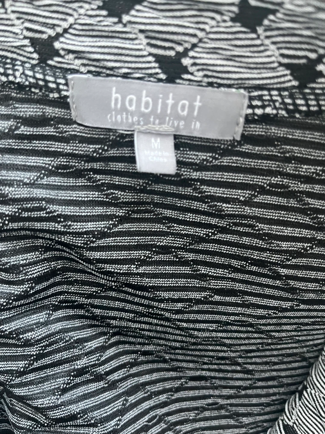 This Habitat sleeveless vest is a women's size medium. It features a black and white patterned fabric and a full zip-up front. It's a great layering piece for cooler weather!