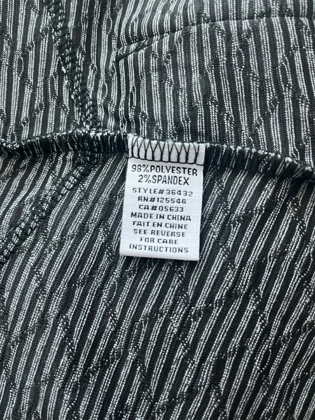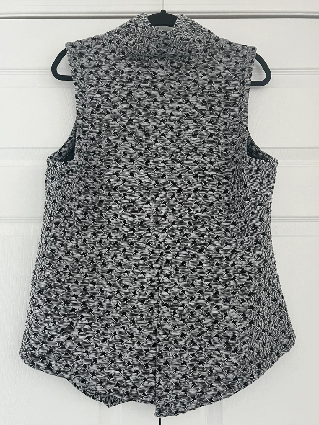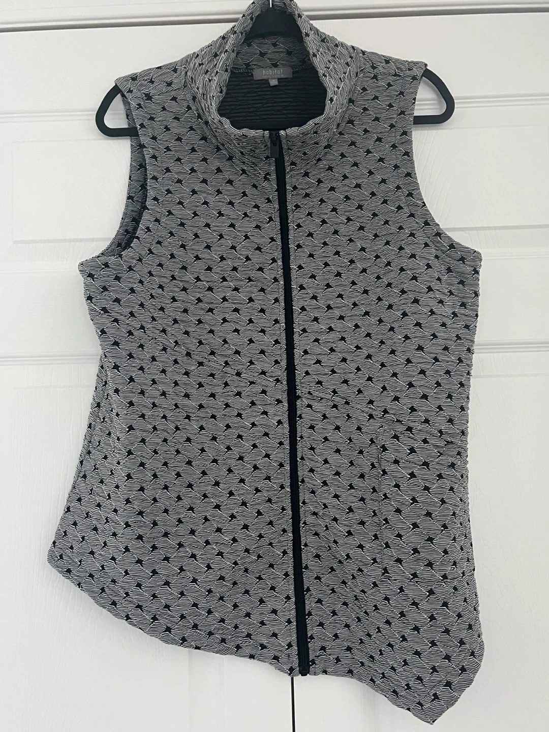 This Habitat sleeveless vest is a women's size medium. It features a black and white patterned fabric and a full zip-up front. It's a great layering piece for cooler weather!