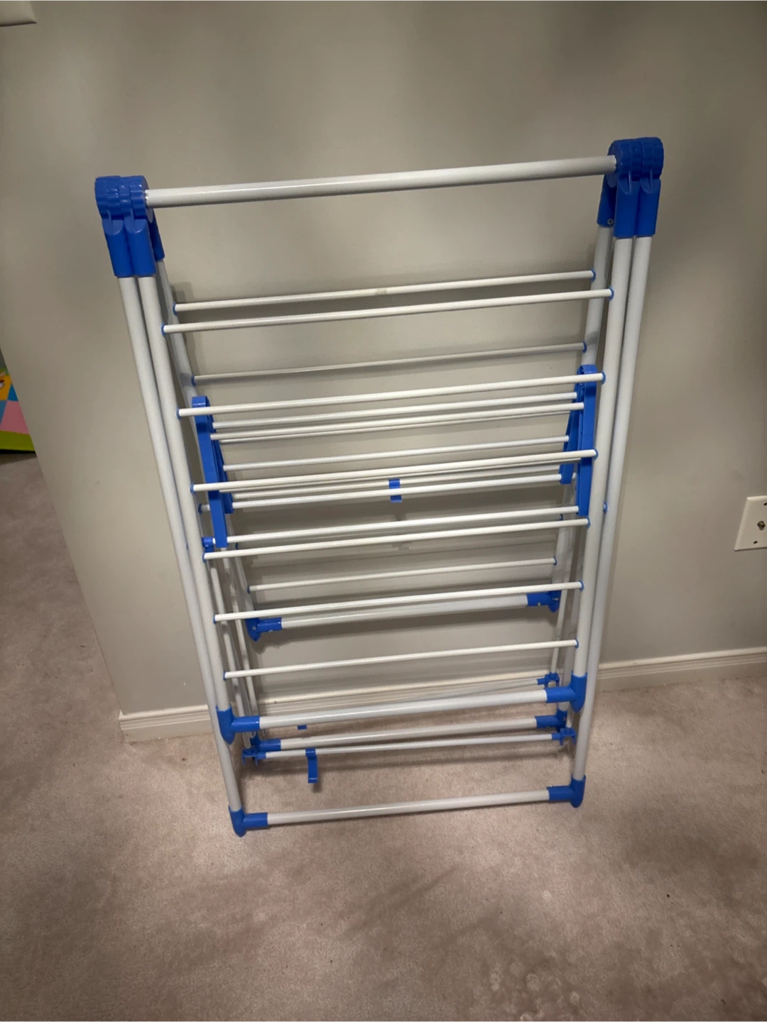 Selling a handy clothes drying rack! It's white with blue accents and folds up for easy storage when you're not using it. Perfect for small spaces or for drying clothes indoors during the winter months