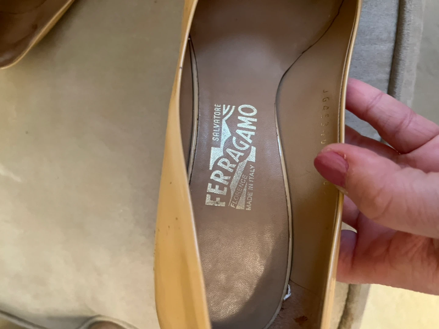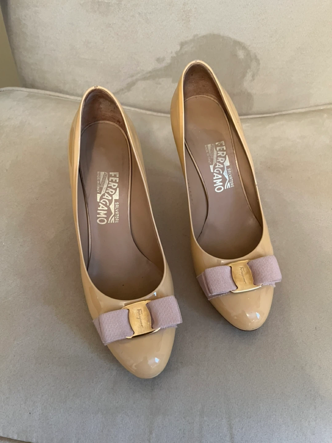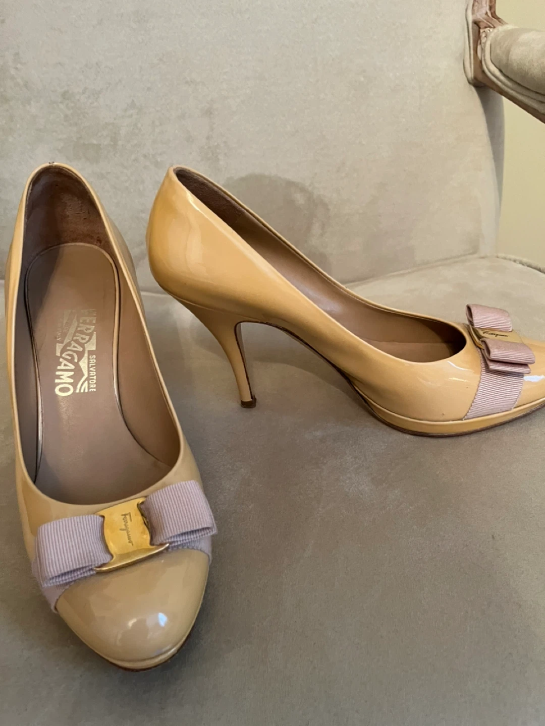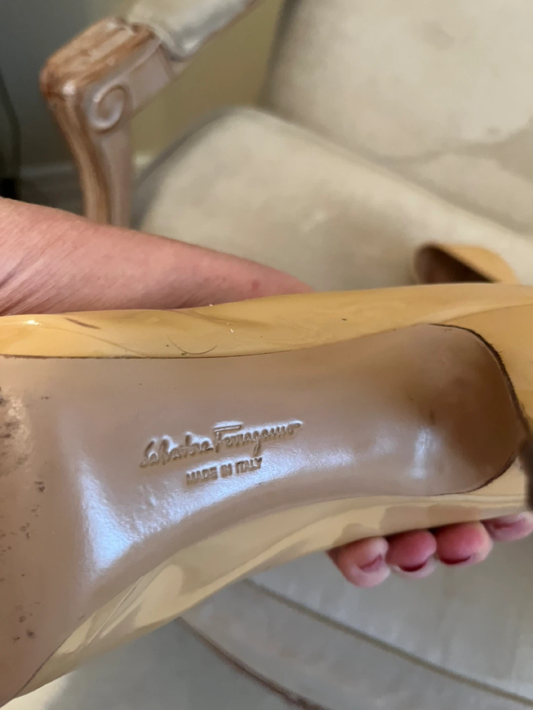 These Salvatore Ferragamo heels are a classic nude patent leather. Please note one shoe has scuff marks. Price reflects that.