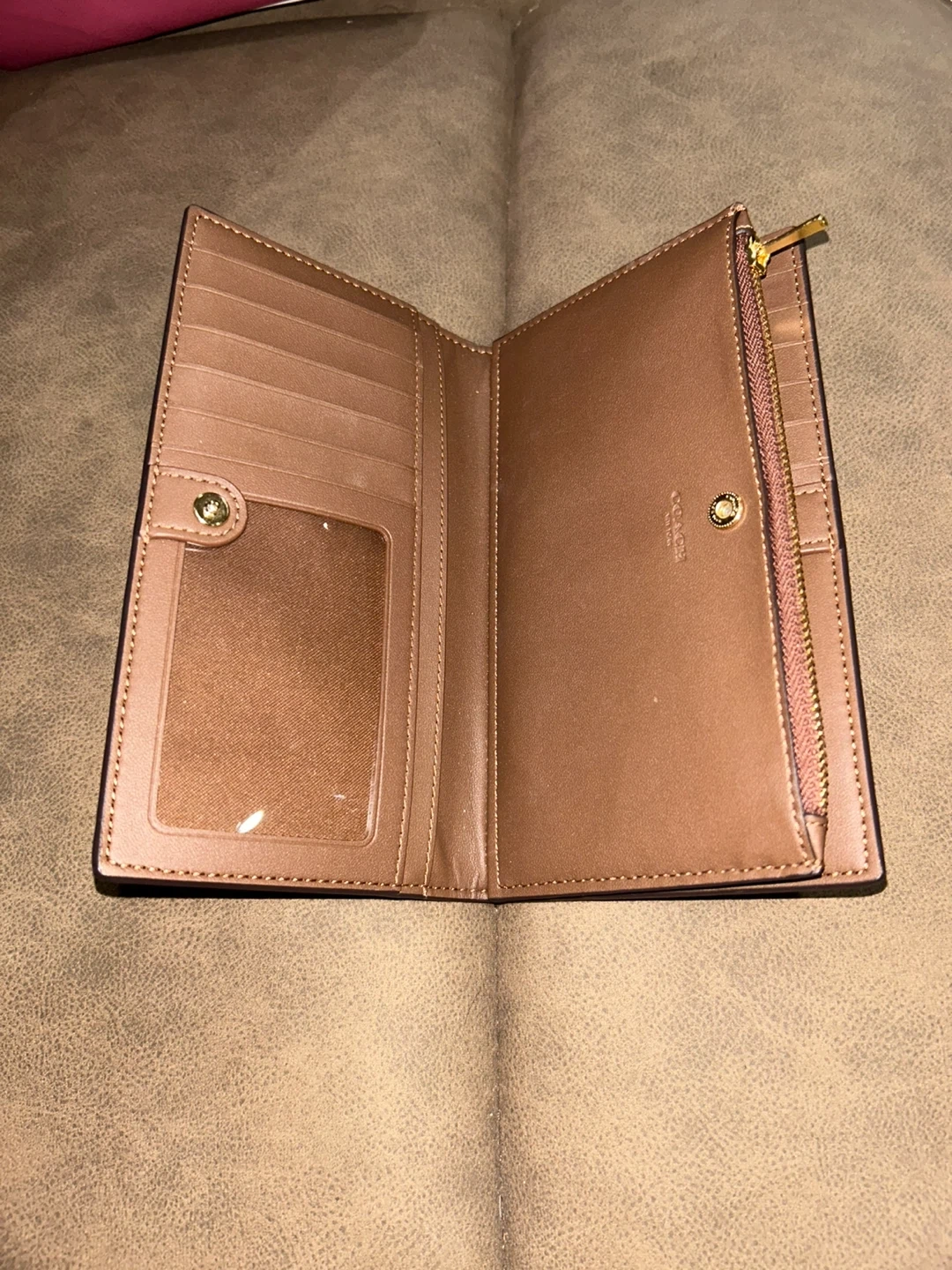 This is a Coach signature canvas tote bag with brown leather trim and a matching bifold wallet. The tote bag features a spacious interior with a zip pocket and slip pockets. The wallet has multiple card slots, a clear ID window, and a zip coin pocket. It's a classic set for everyday use!
