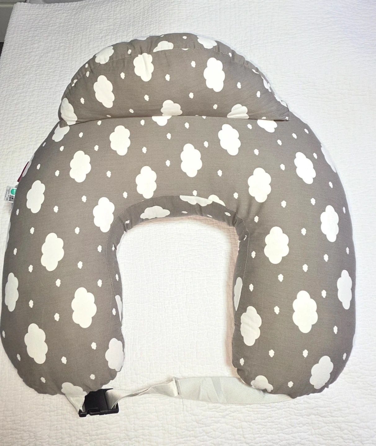 This grey nursing pillow features a cute white cloud pattern. It's designed for comfort during feeding times. The pillow has a soft fabric and a supportive shape.