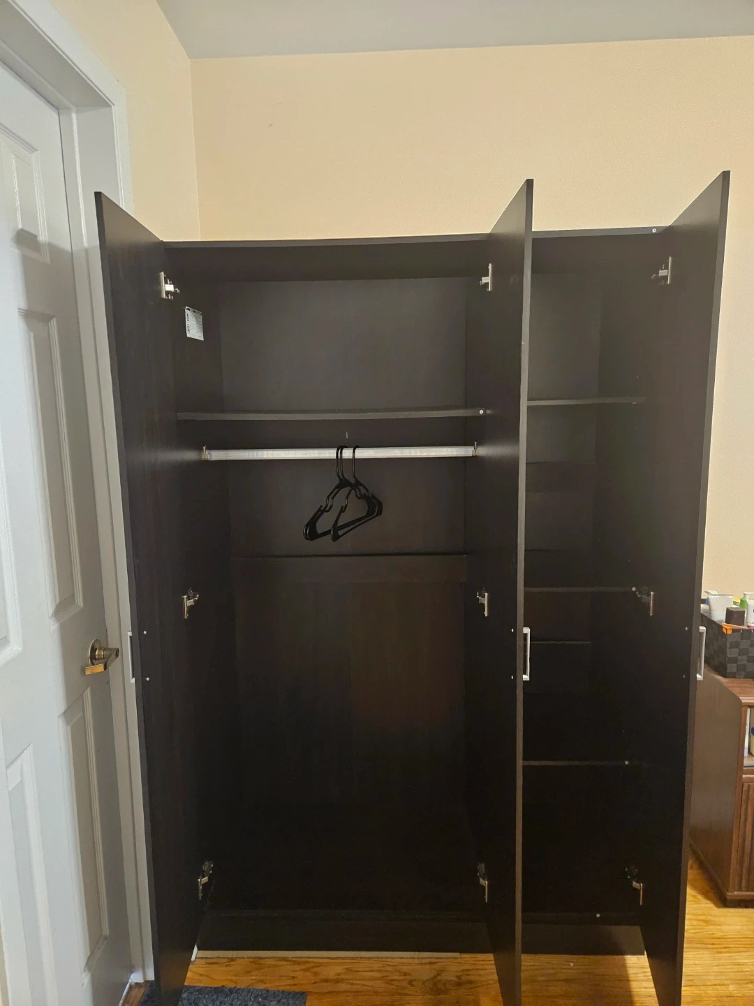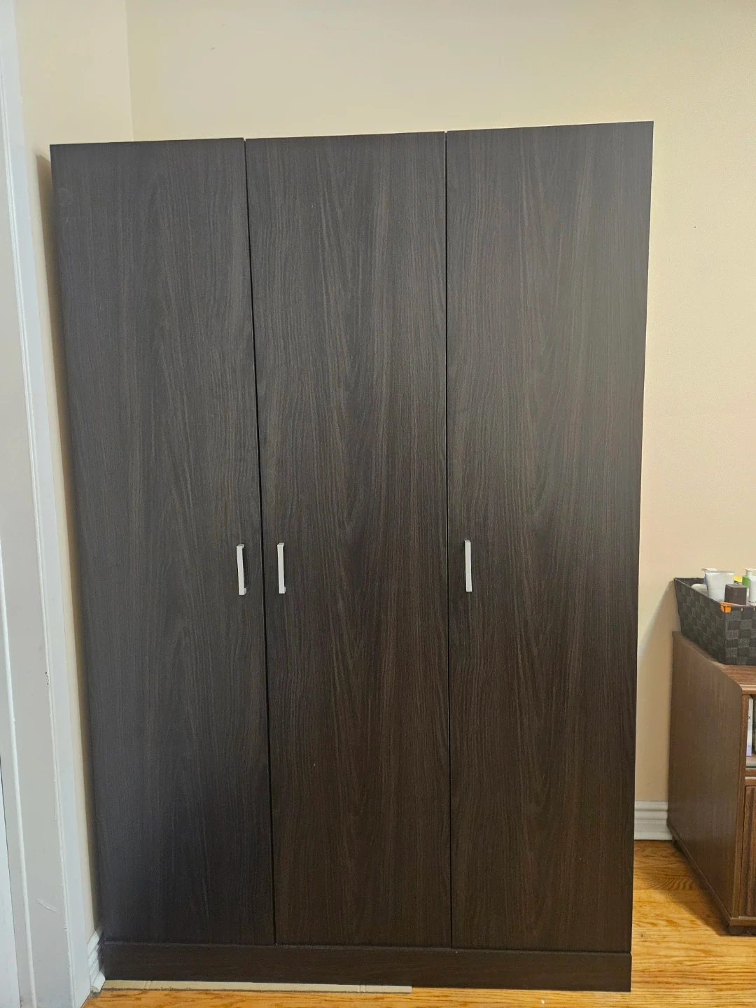 Selling a dark brown three-door wardrobe. It's in great condition and perfect for adding extra storage to any room. It has a sleek design that will fit in with most decor styles. Inside, there's a hanging rod and shelving to keep your clothes and accessories organized