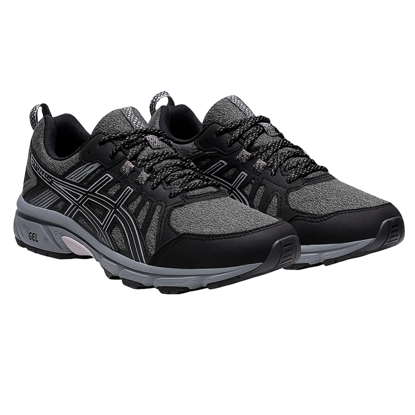 ASICS Gel-Venture 8 running shoes in black and grey. These trail running shoes feature GEL cushioning and a durable rubber outsole for traction. They're designed for active lifestyles and outdoor adventures.