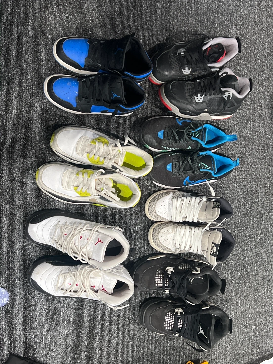 Selling a collection of used Nike and Jordan sneakers. Various models and sizes, with signs of wear. Please see photos for details