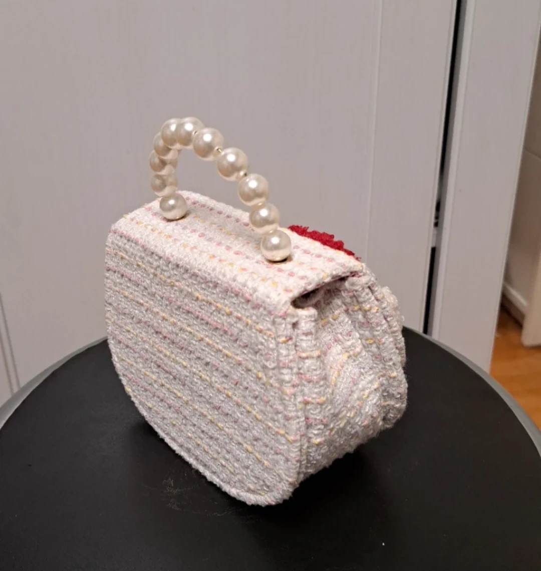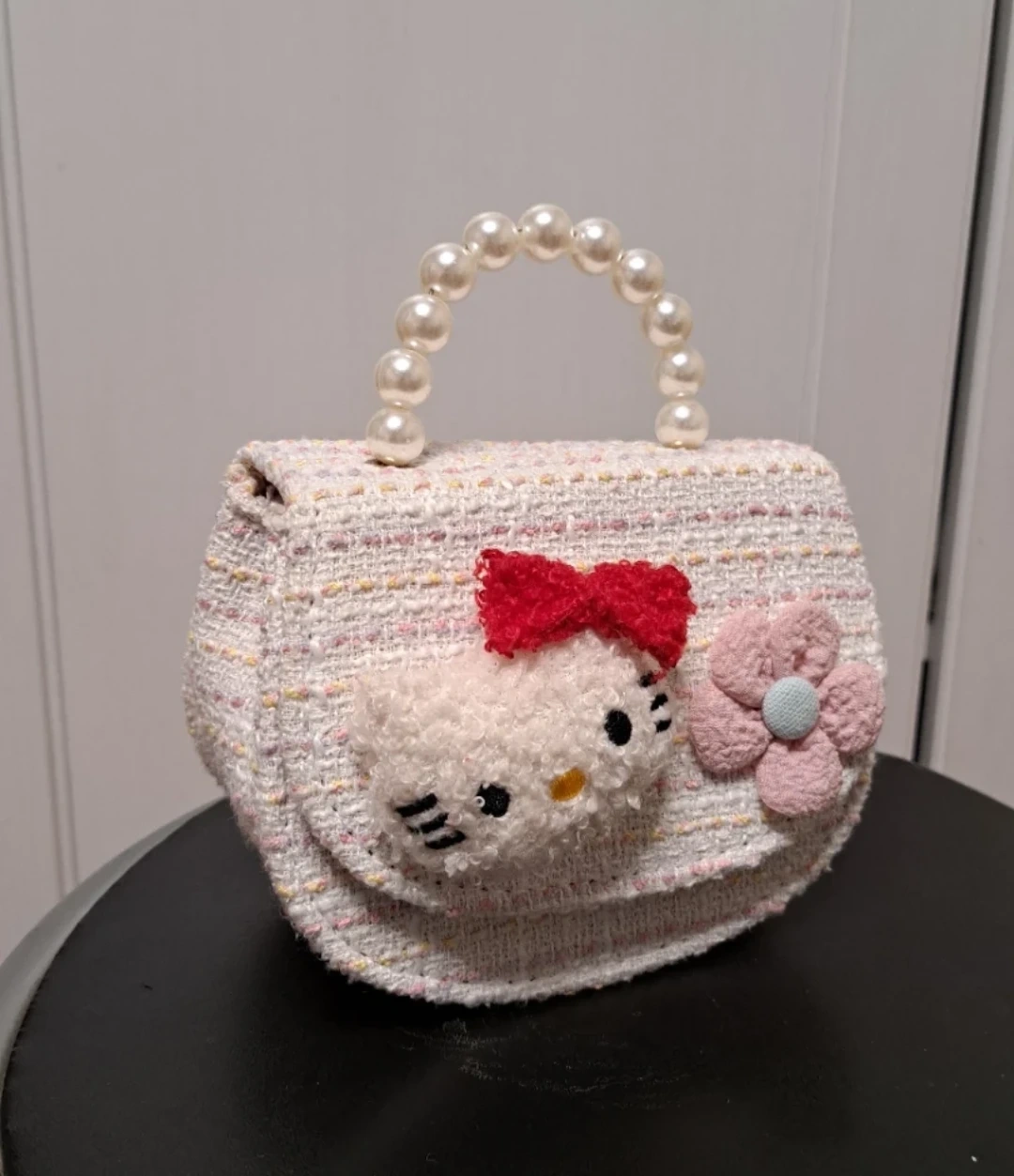 Super cute Hello Kitty mini bag! It's a tweed material with a pearl handle and a gold chain strap. Perfect for adding a touch of whimsy to any outfit.