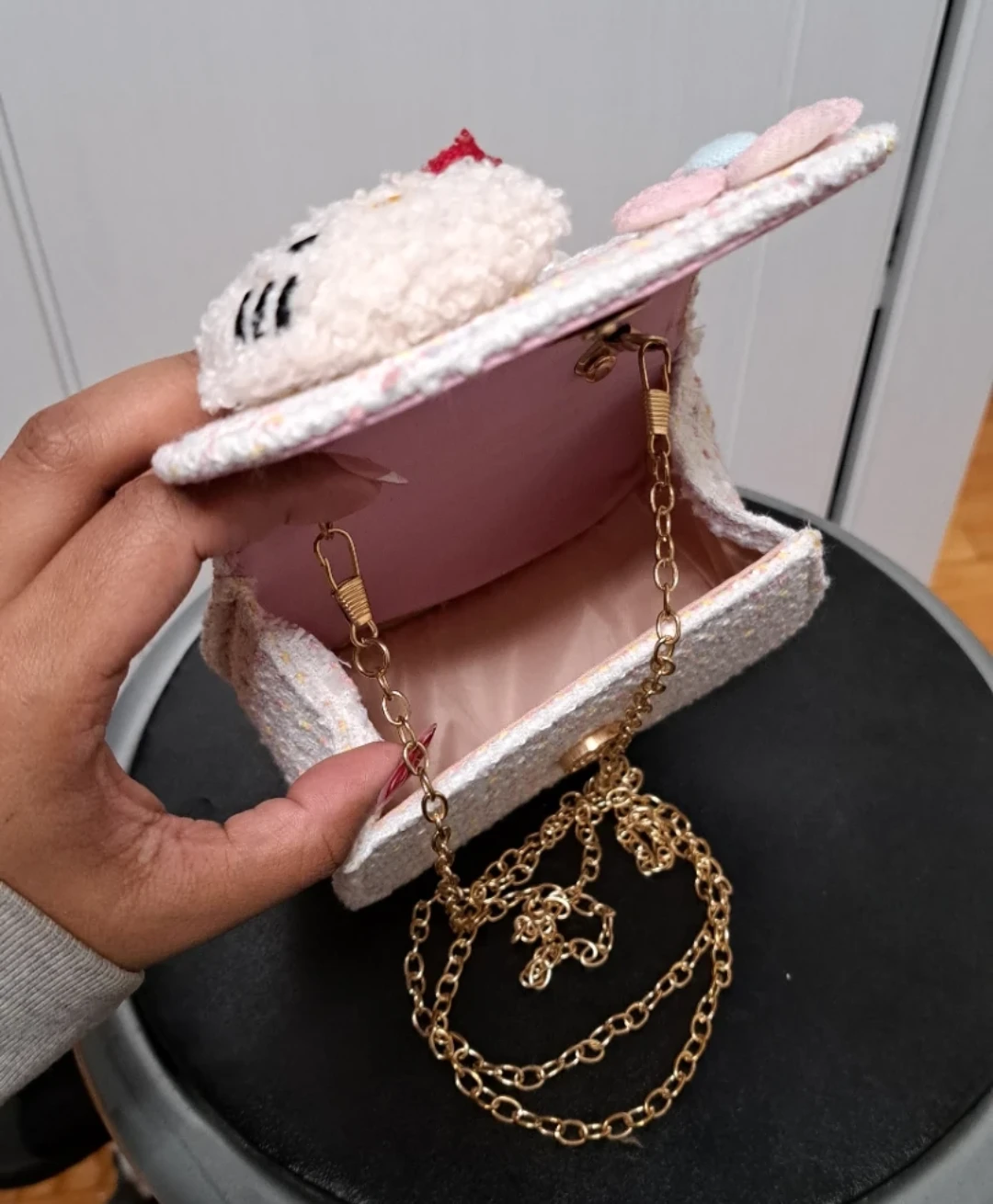 Super cute Hello Kitty mini bag! It's a tweed material with a pearl handle and a gold chain strap. Perfect for adding a touch of whimsy to any outfit.
