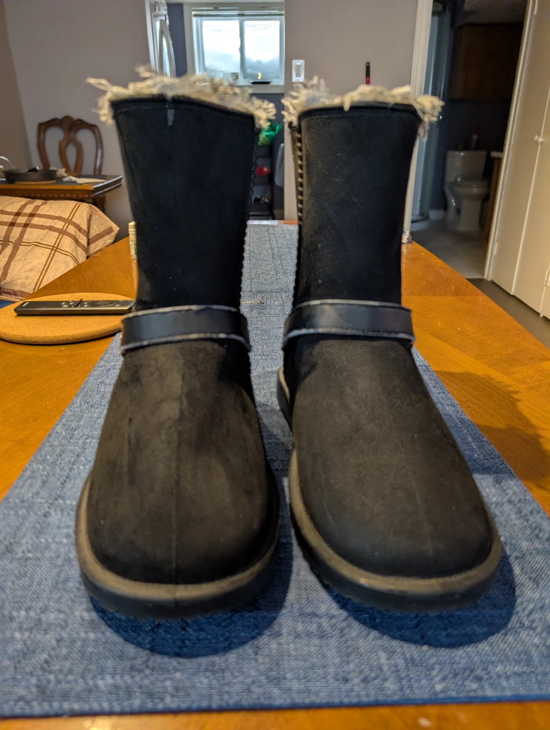 Warm and cozy black faux suede boots. These mid-calf boots feature a faux fur lining and a decorative buckle strap. They're perfect for keeping your feet toasty on chilly days! The outer material is faux suede and the lining appears to be faux fur.