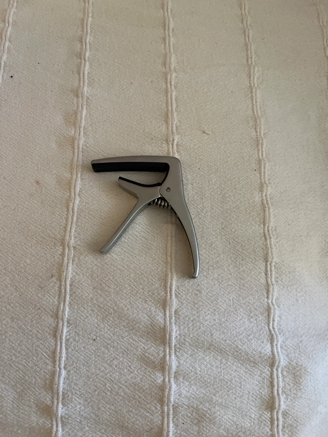 This is a silver guitar capo. It's made of durable metal and has a comfortable rubber grip. Spring-loaded for quick changes.