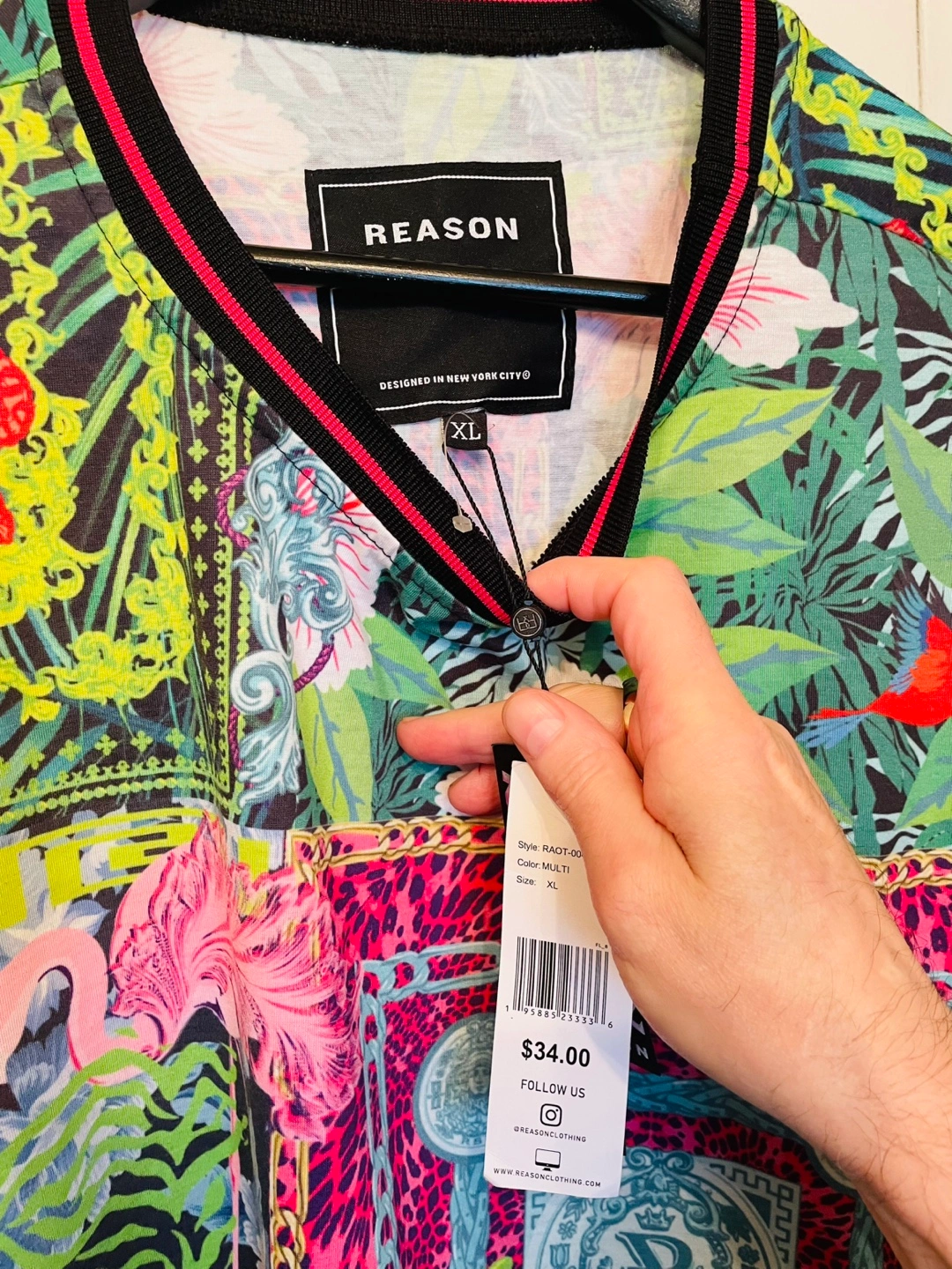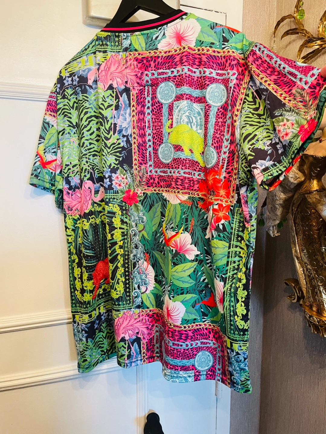 Short sleeve polo shirt. Size XL. Vibrant tropical print featuring flamingos, flowers and chains. Designed in New York City.