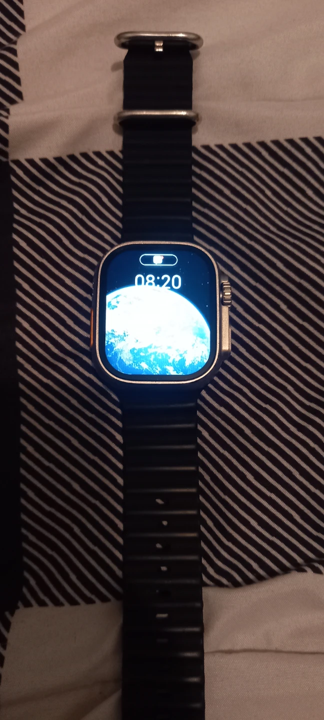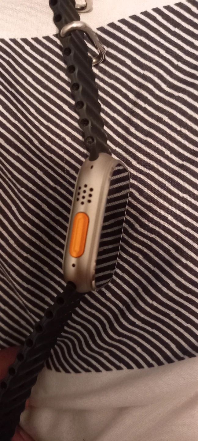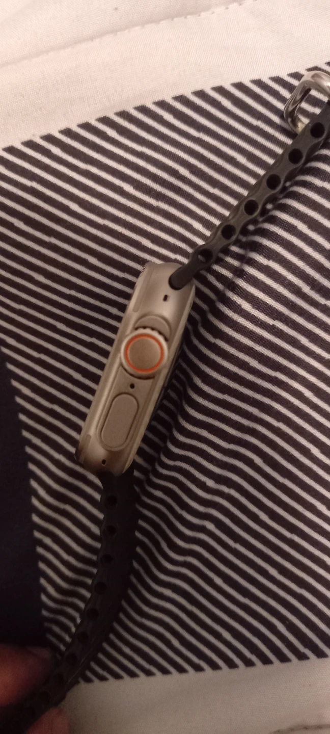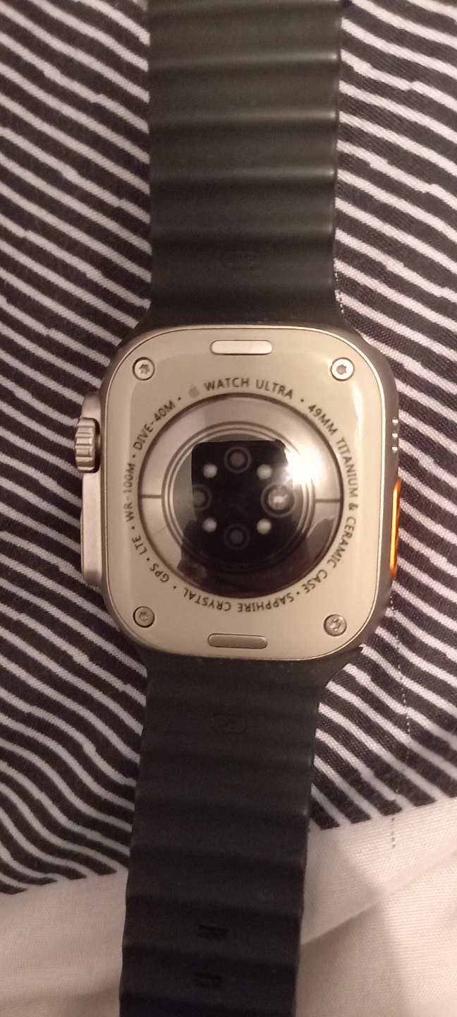 This is the Watch Ultra with a 49mm titanium case. It features a sapphire crystal and GPS. It's water resistant up to 100 meters.