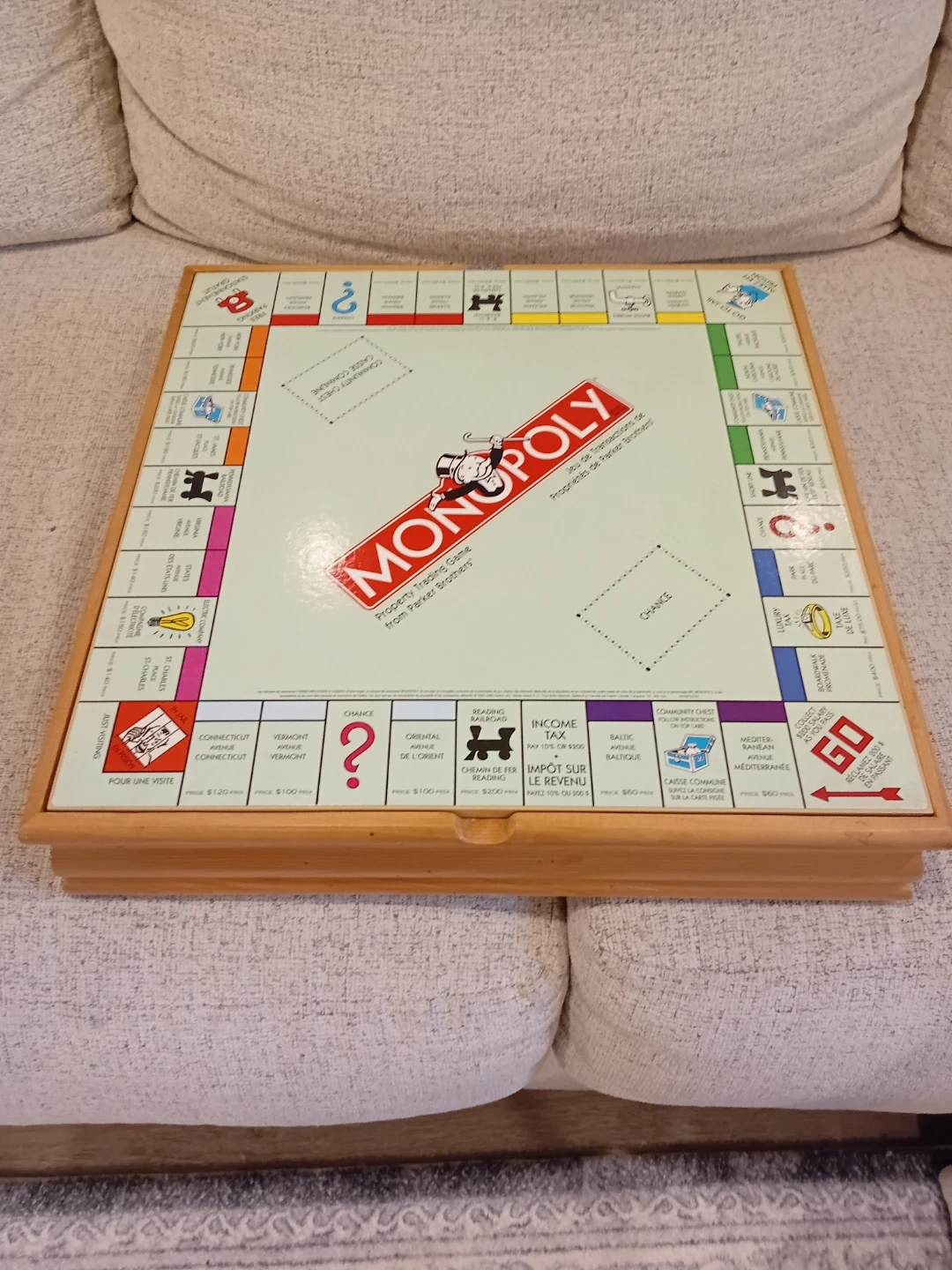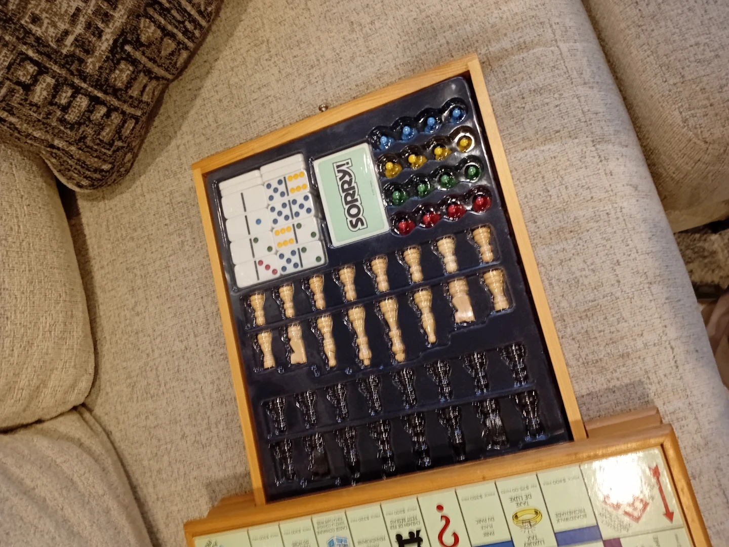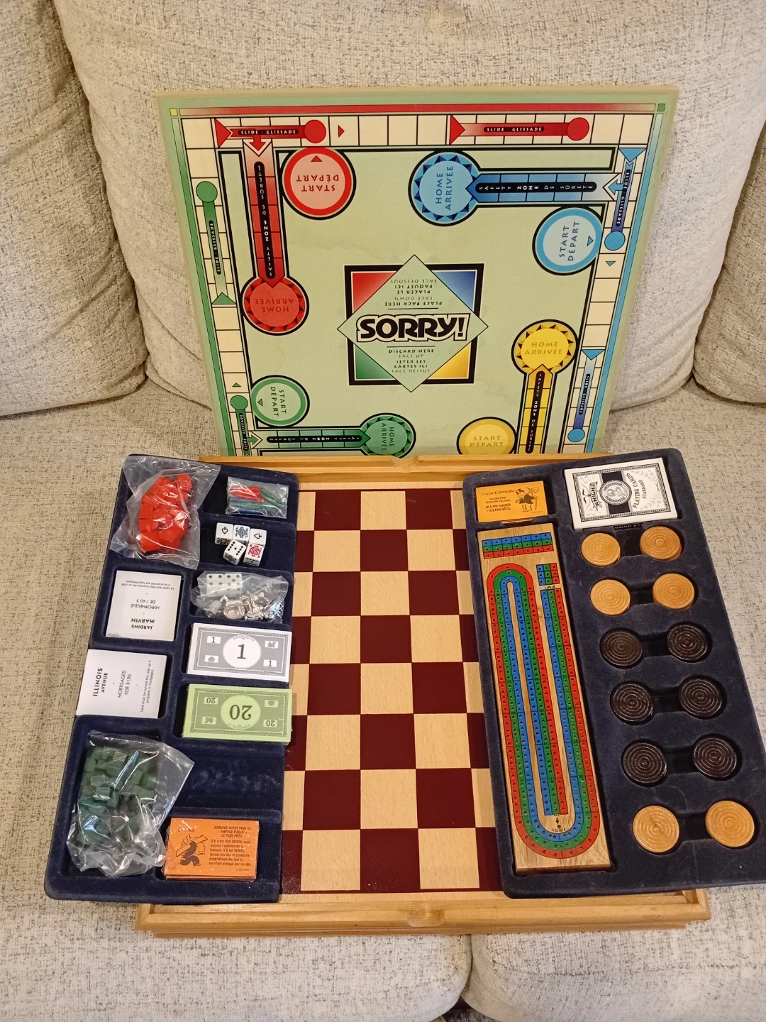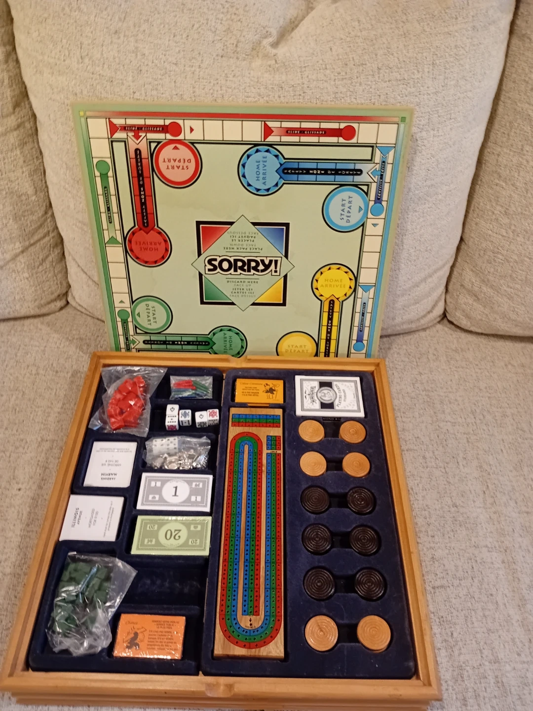 This set includes Monopoly and Sorry! board games with all their pieces. It also comes with a cribbage board and dominoes, checkers and chess pieces. Perfect for the cottage on rainy days.
