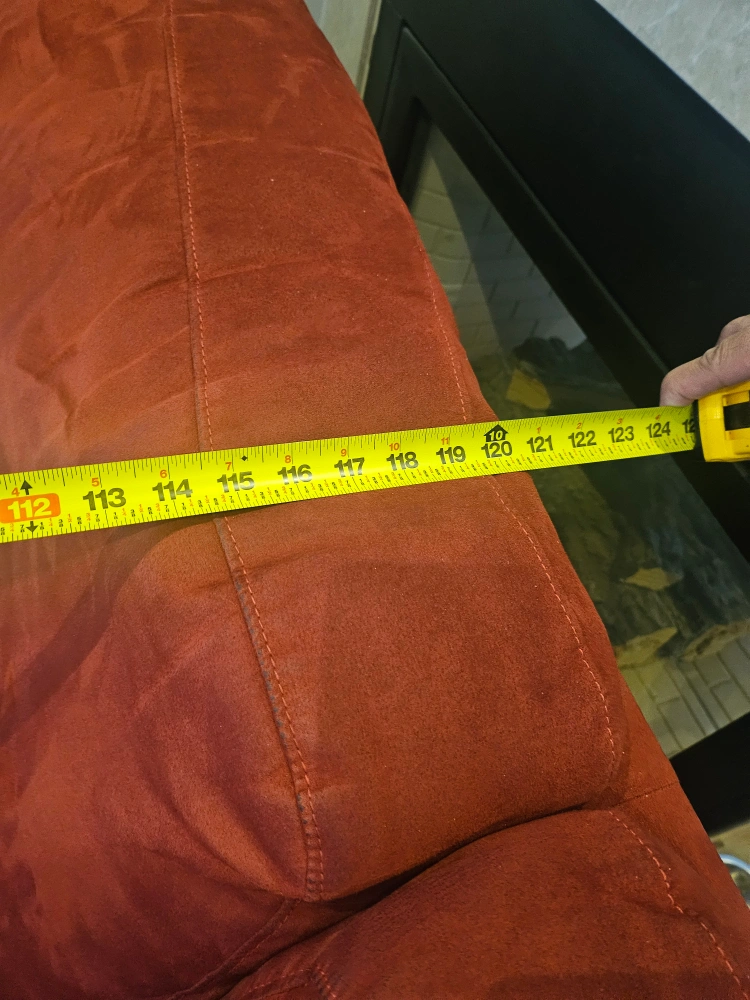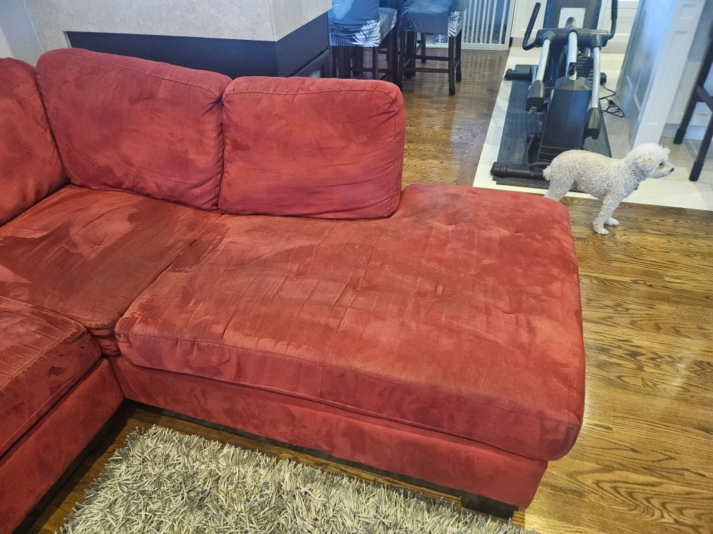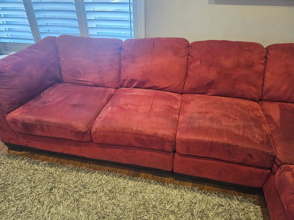 Large red sectional sofa. Microfiber suede Includes chaise lounge. in great condition. Measures approximately 120 inches long and 80 inches wide.