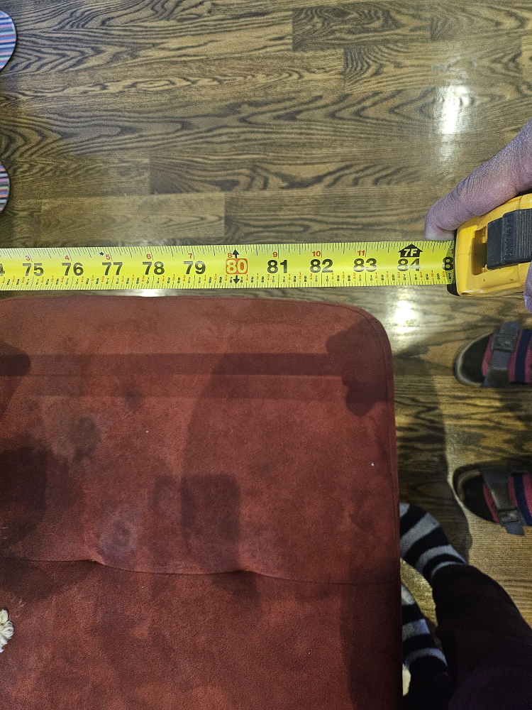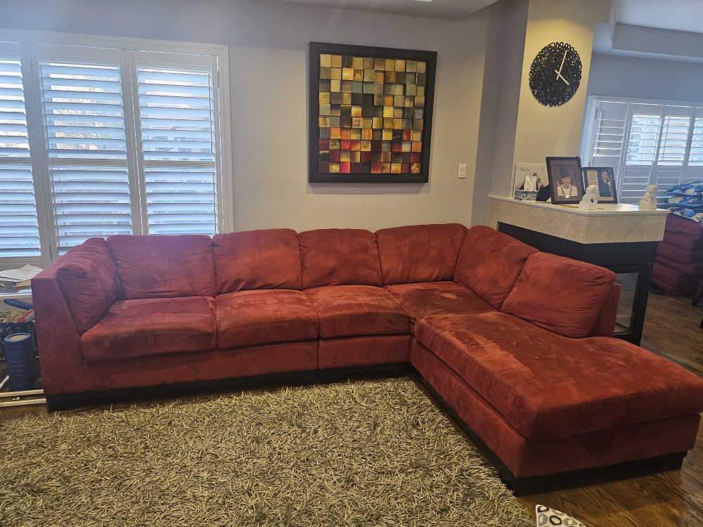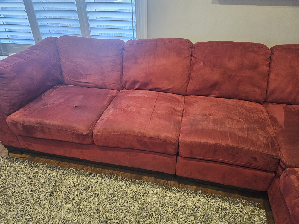 Large red sectional sofa. Microfiber suede Includes chaise lounge. in great condition. Measures approximately 120 inches long and 80 inches wide.
