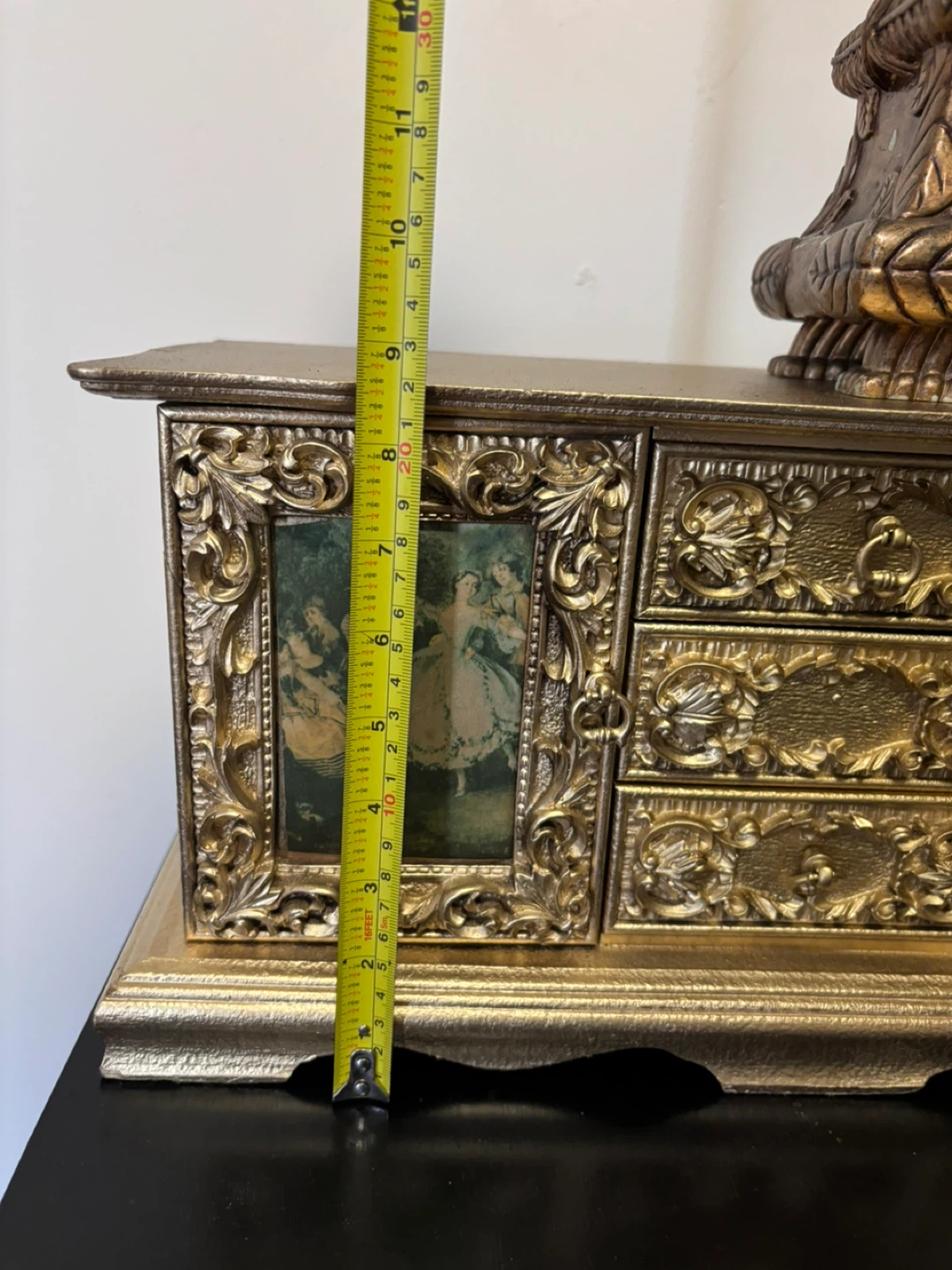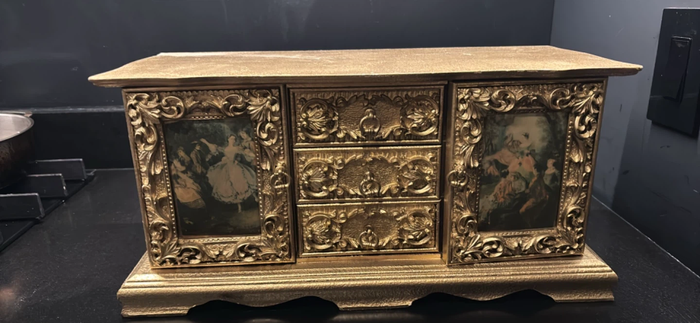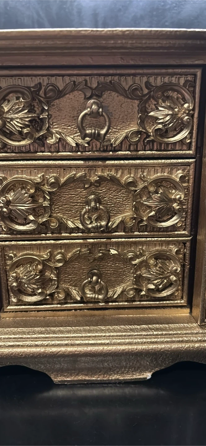 Buy & SellGold Ornate Jewelry Box with Drawers and Hinged DoorsGold Ornate Jewelry Box with Drawers and Hinged Doors$40Ornate gold jewelry box. Features three small drawers and two hinged doors with painted scenes.ConditionGoodWHERE TO MEETJunior's Restaurant & BakeryView MapSELLERverifiedLegacyDowntown Brooklyn600 reviews1 chats·5 favorites·66 viewsSEND CHAT TO SELLERHi Legacy! I’m interested in your listing.Hi Legacy! I’m interested in your listing.Get the Karrot app to chatSign In to chat