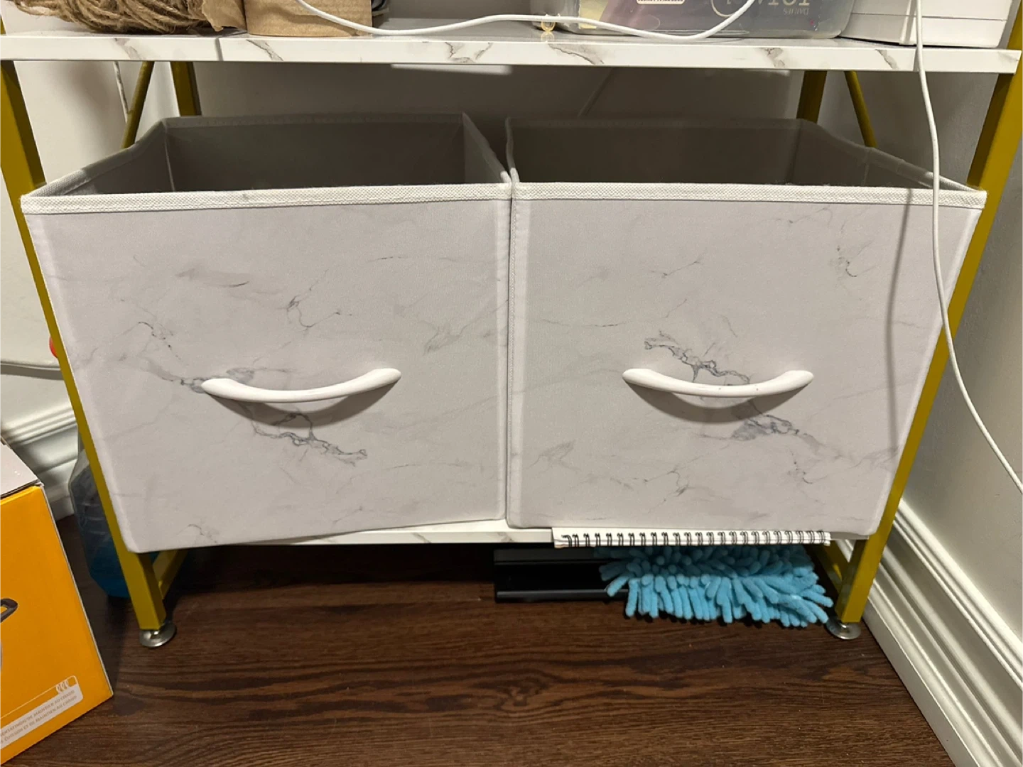 These storage bins are great for keeping your shelves organized! They have a nice marble pattern and handles for easy use. Perfect for any room in the house