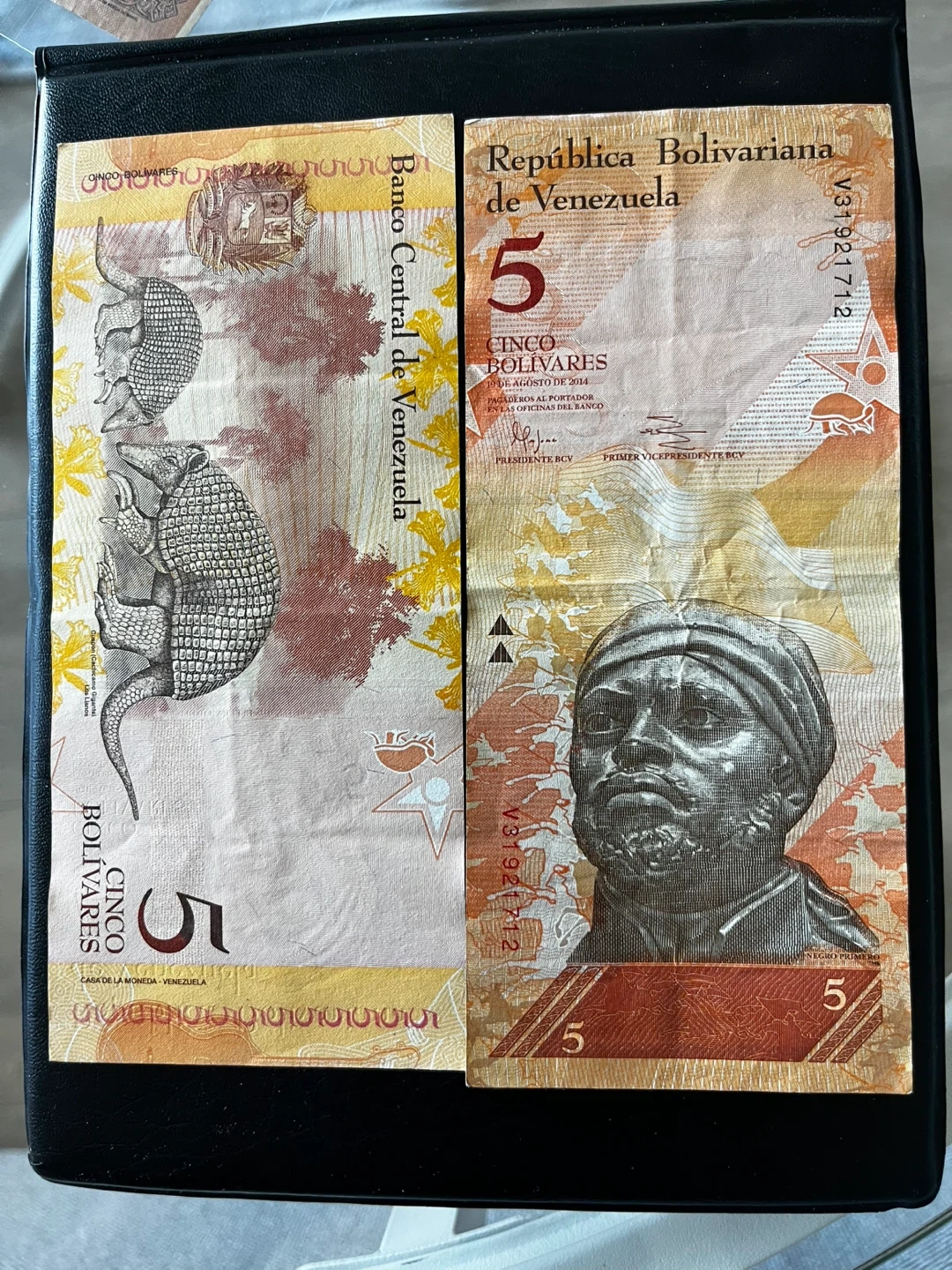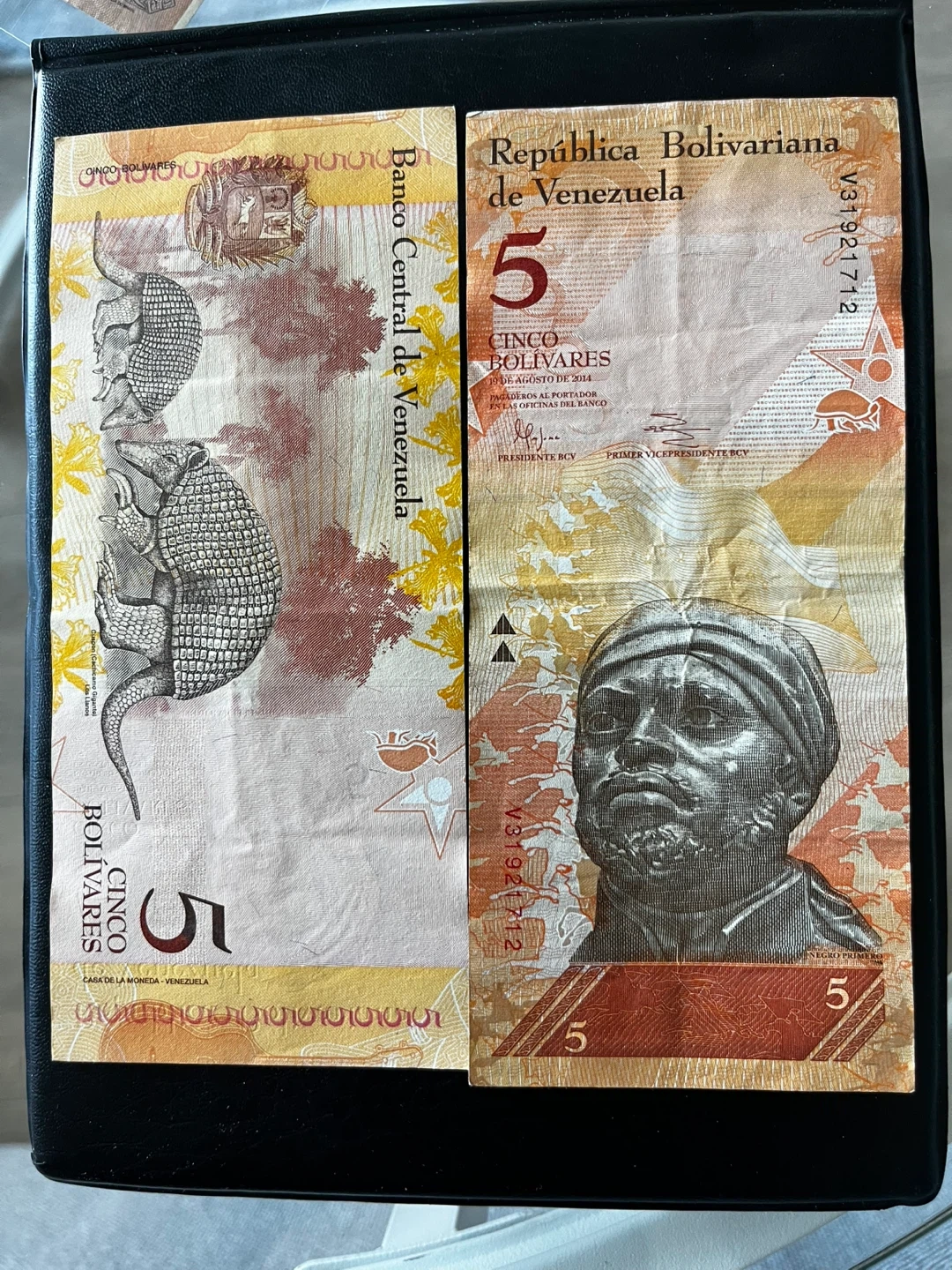 One banknote from the Republic of Venezuela, denomination of 5 Bolivares. It features an armadillo on one side and a portrait on the other. Dated August 2014.