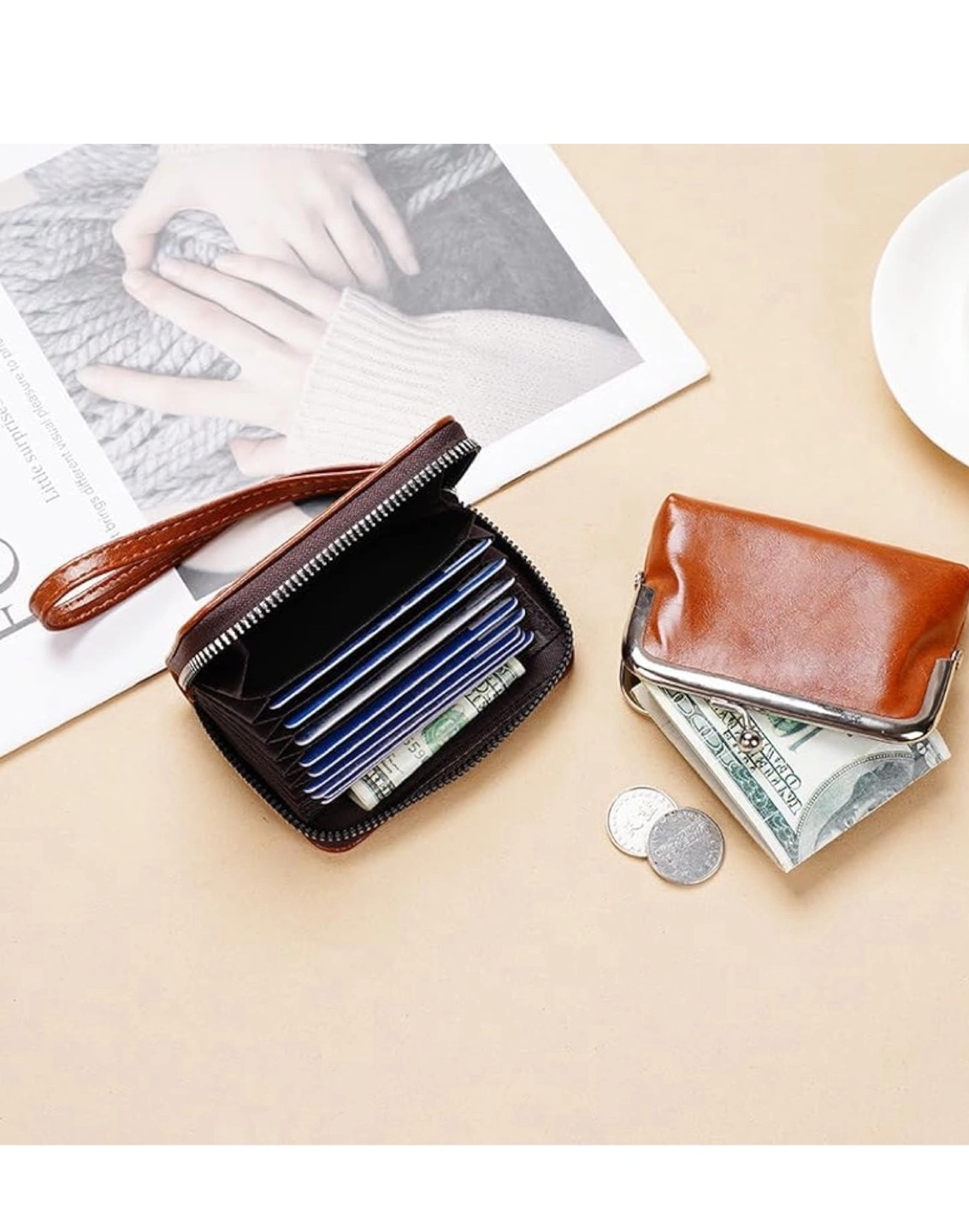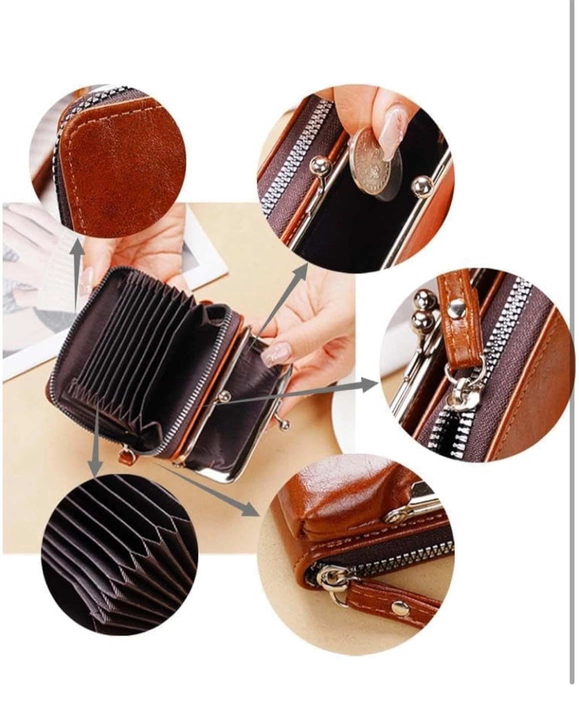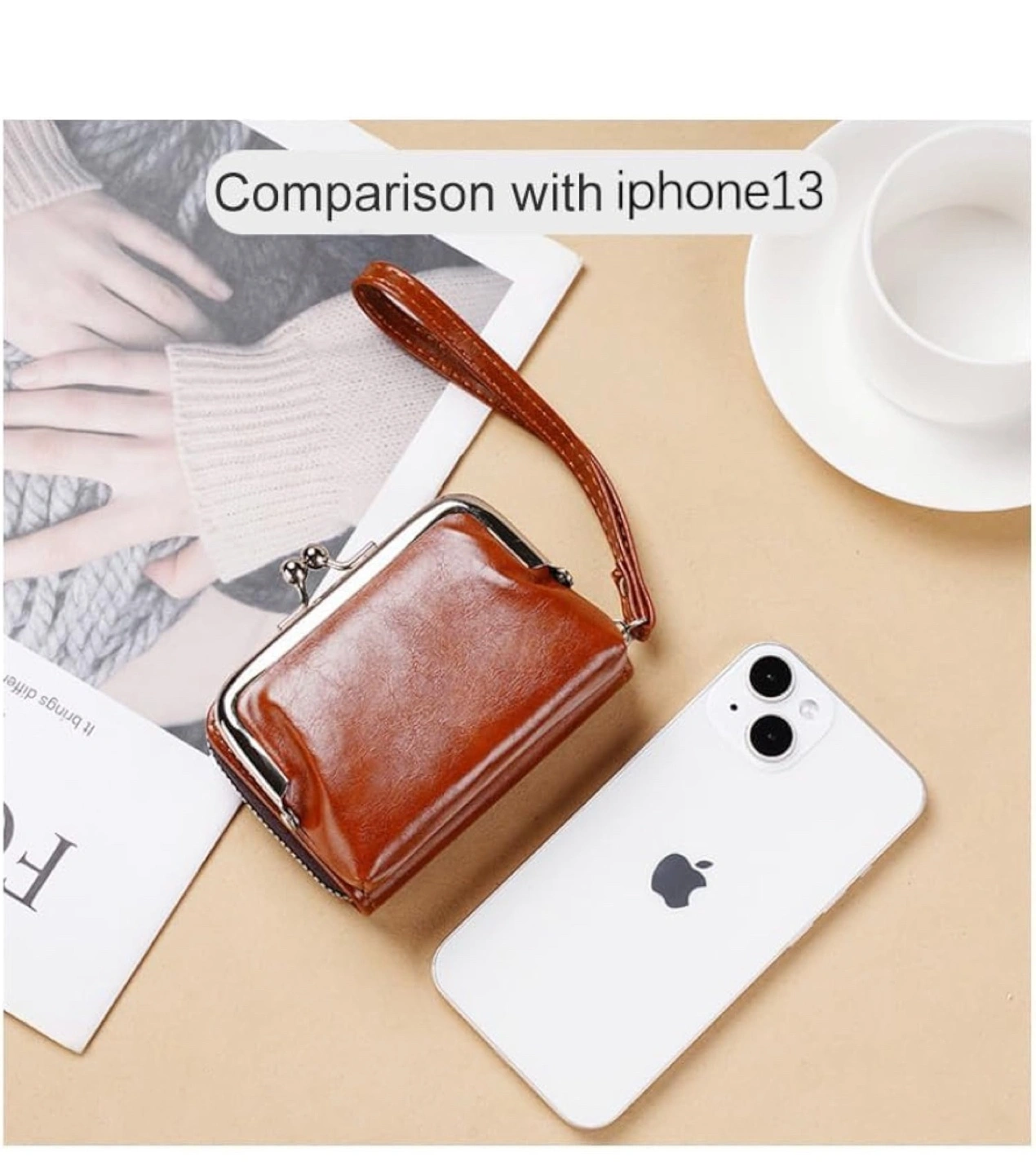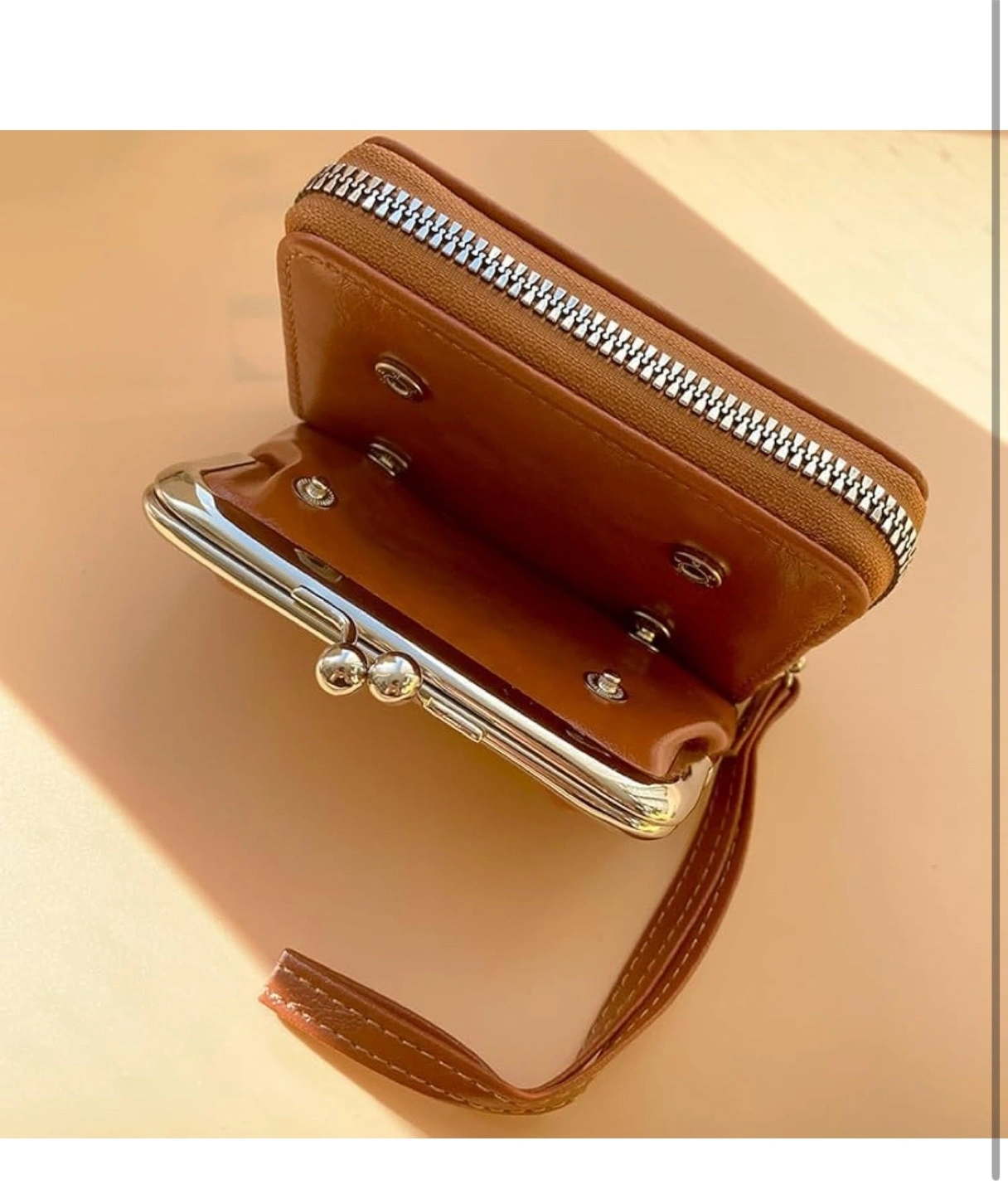 Cute small clasp wallet. Features a kiss-lock clasp. Includes a small handle strap. Carrying a wallet like this can be very soothing.