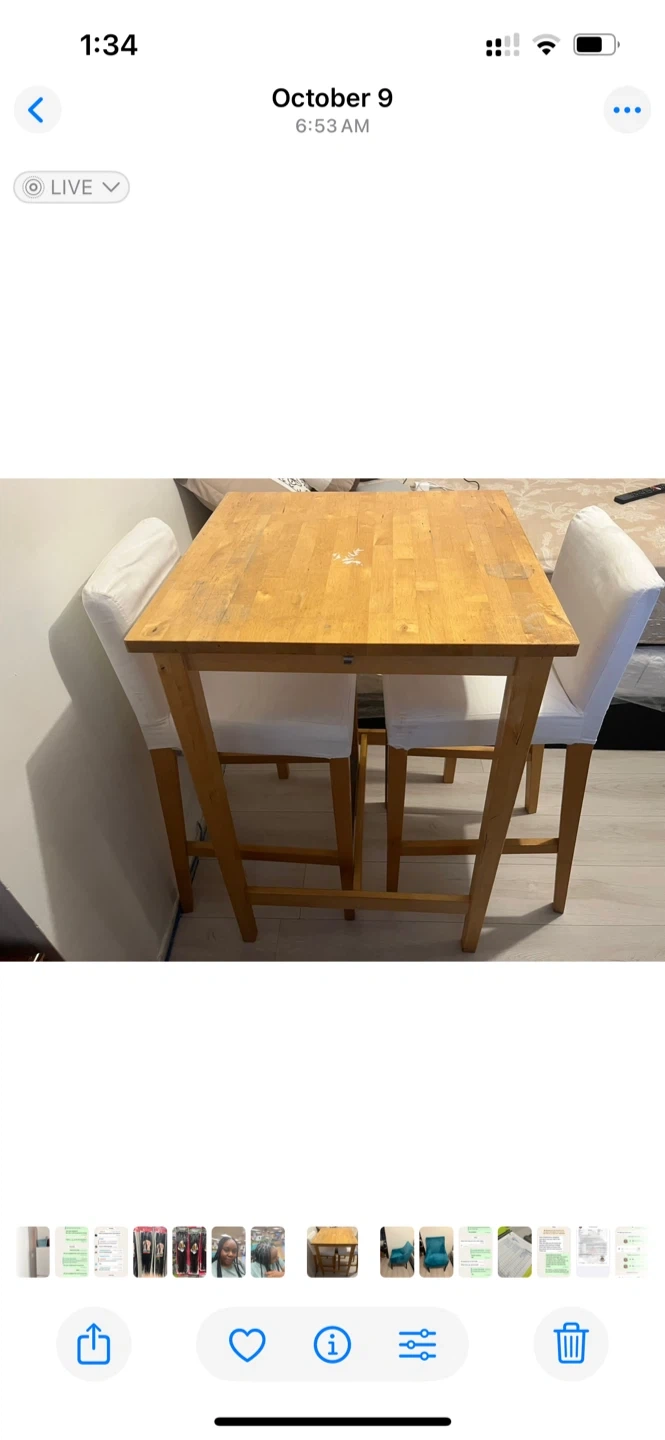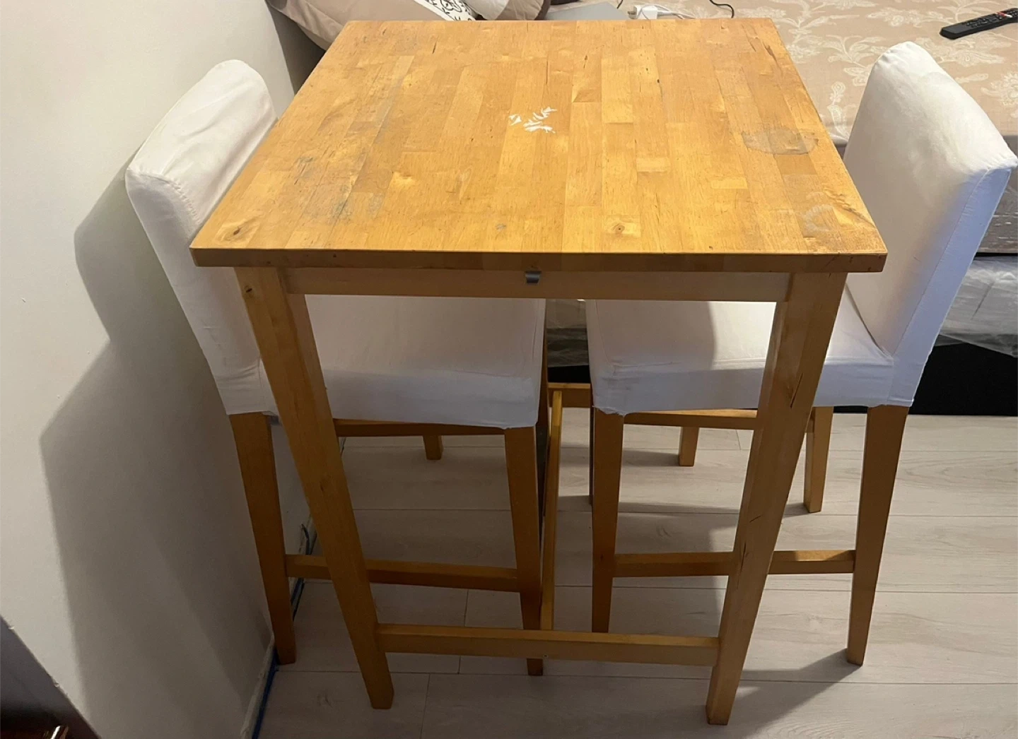 This is a compact wooden bar table set, perfect for smaller spaces. It comes with two white upholstered stool chairs. The table's natural wood finish complements most decors.