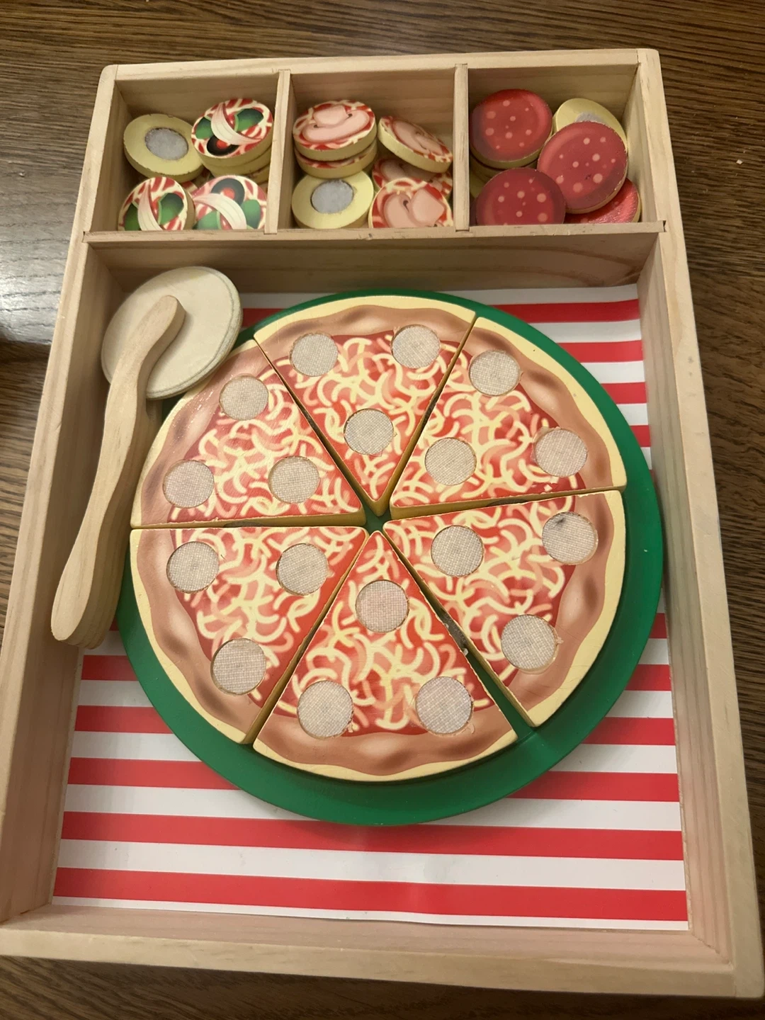 This is a cute wooden pizza play set! It comes with a pizza that is divided into slices, various toppings, a pizza cutter, and a wooden tray with compartments to hold the toppings. It's perfect for imaginative play and developing fine motor skills