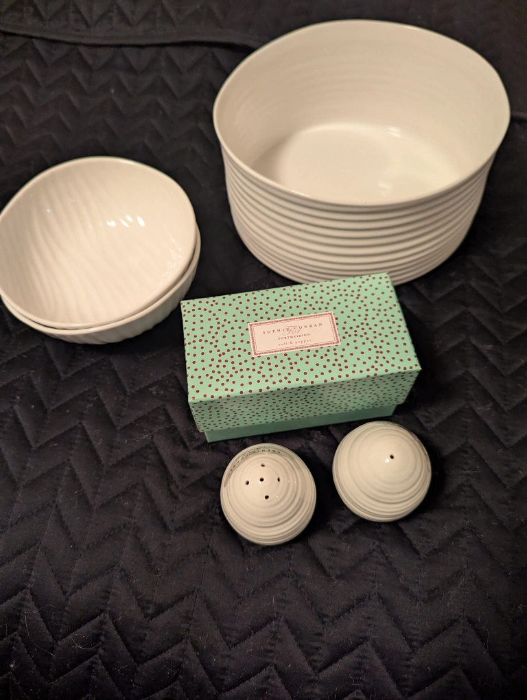 Includes large 8 inches in diameter bowl, 2 small side bowls and a salt & pepper set.