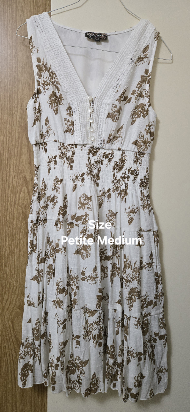 Selling a cute dress in petite medium! It's a white sleeveless dress with a brown floral pattern. Only worn once
