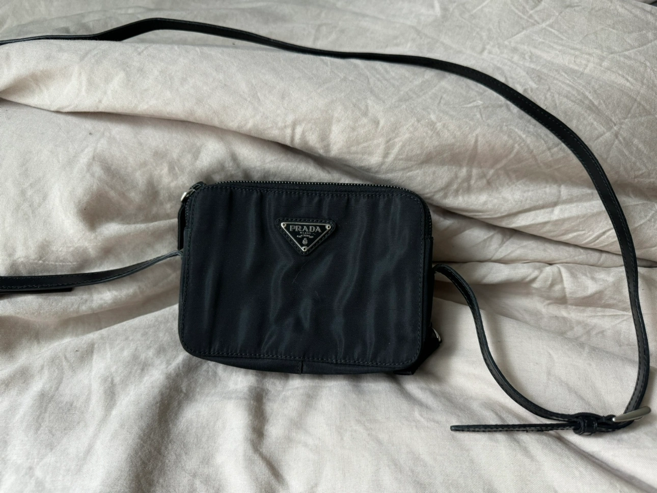 Black nylon Prada mini bag with a silver triangle logo. The bag has a top zipper closure and a long adjustable shoulder strap.