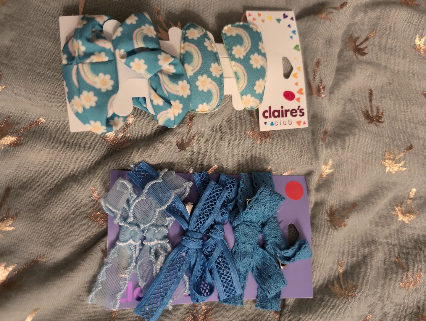 Set of hair bows and clips from Claire's Club. Includes rainbow and floral patterns with blue lace accents. Perfect for adding a pop of colour to hairstyles! In original packaging
