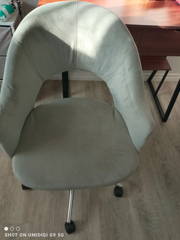 Comfortable rolling office chair. Sage green velvet upholstery. Chrome base and casters. Shows some minor wear.