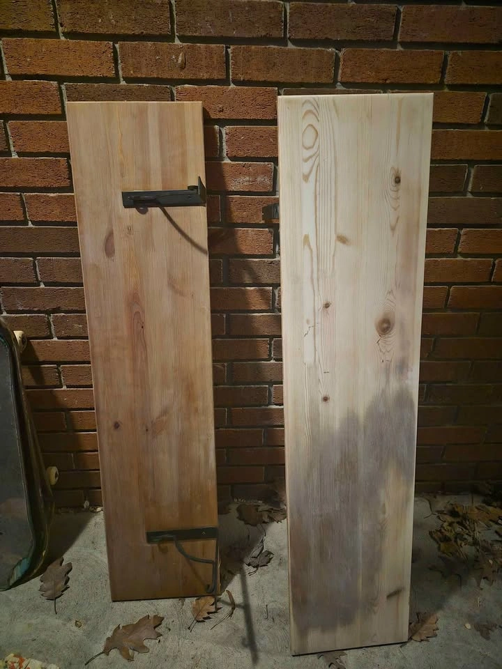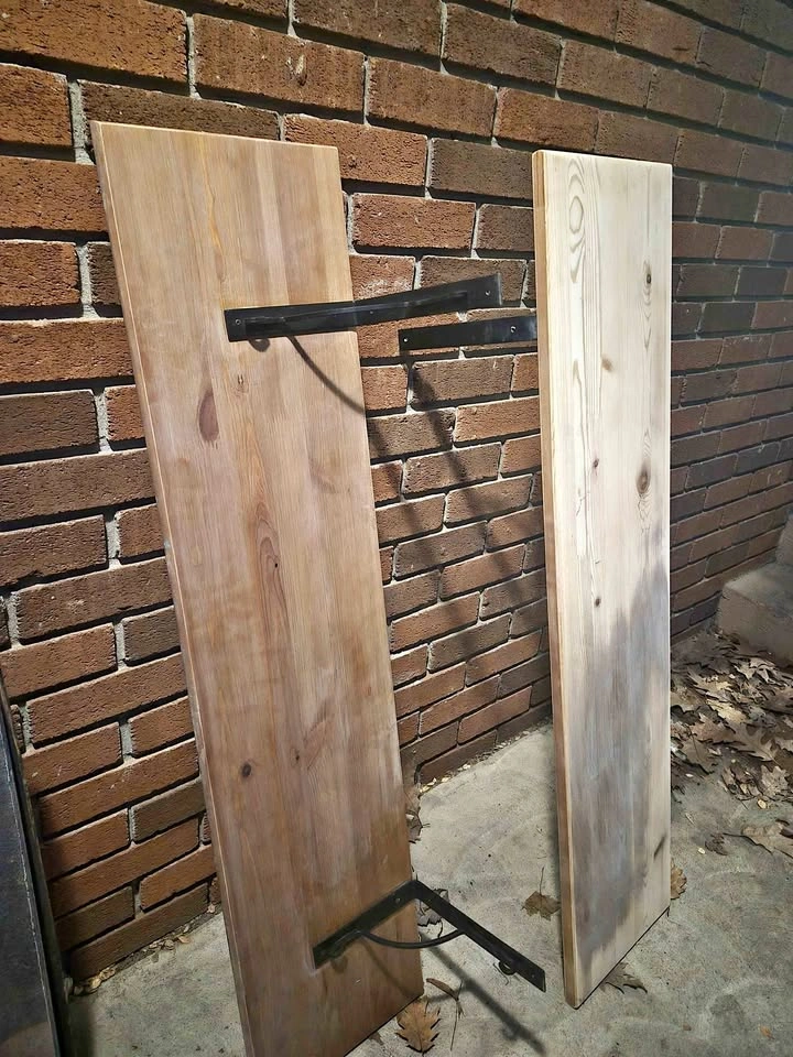 2 wood shelves with wall mounting brackets. $20 for both. One is partially sanded as a project but never completed. Good condition, real wood. You can paint or stain.