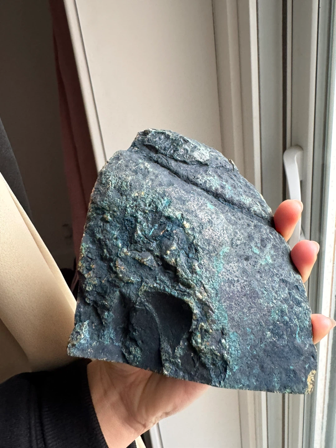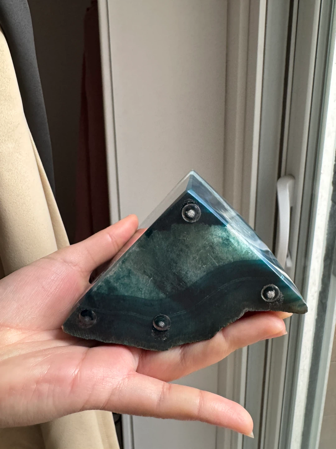 Blue and white geode slice with a natural edge and a polished green agate pyramid with small metal accents. This is a beautiful natural stone display items