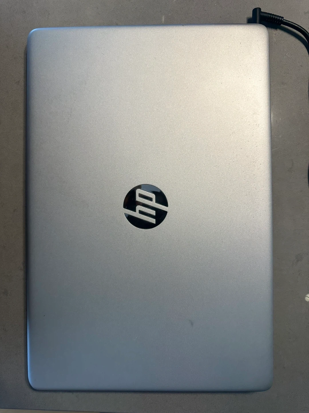 This is a silver HP laptop, complete with its charger. It also includes a clear protective case for the laptop. This setup is ready for use or for someone needing a reliable device. And the specs are AMD Ryzen 7 (5000 series) and AMD Radeon graphics