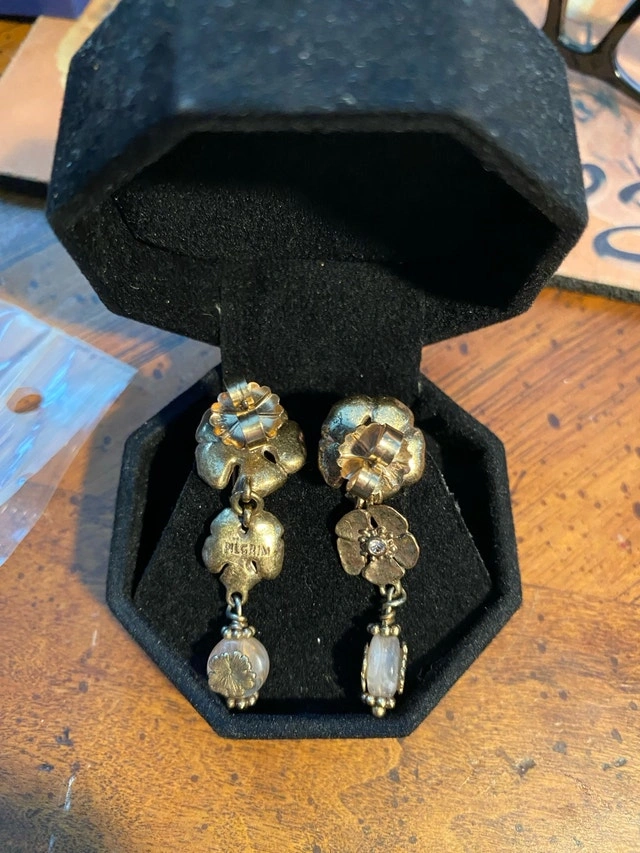 Pilgrim brand dangle earrings featuring a multi-flower (clovers) design. The visible "PILGRIM" inscription on the back of one earring identifies them as being from the Danish jewelry maker known for their hand-finished, high-quality costume jewelry.