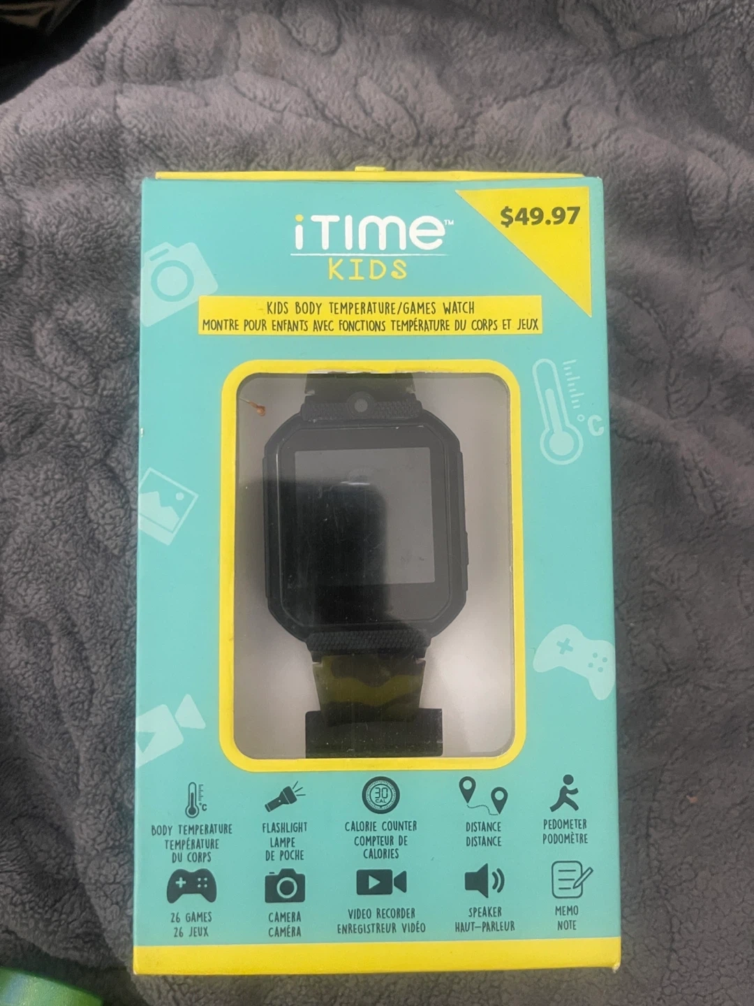 Selling an iTime Kids Body Temperature/Games Watch. It comes with the original box and a charging cable. This watch has 26 games, a camera, a video recorder, a calorie counter, and more! Originally bought for $49.97